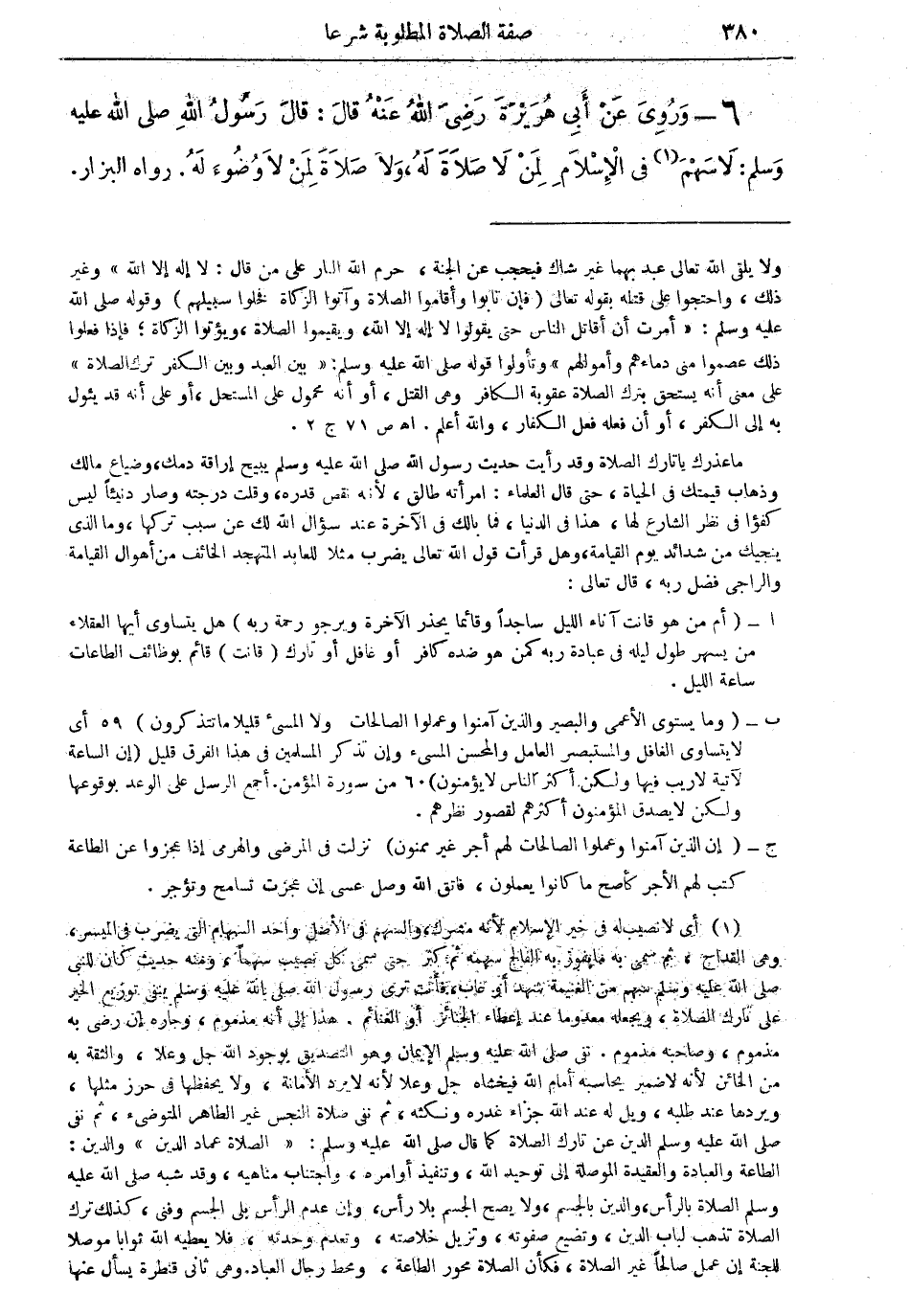 (¬1) أي لا نصيب له في خير الإسلام لأنه مشرك، والسهم في الأصل واحد السهام التى يضرب في الميسر، وهى القداح، ثم سمى به ما يفوز به الفالج سهمه ثم كثر حتى سمى كل نصيب سهماً، ومنه حديث كان للنبى صلى الله عليه وسلم سهم من الغنيمة شهد أو غاب، فأنت ترى رسول الله صلى الله عليه وسلم ينفى توزيع الخير على تارك الصلاة، ويجعله معدوما عند إعطاء الجنائز أو الغنائم. هذا إلى أنه مذموم، وجاره إن رضي به مذموم، وصاحبه مذموم، نفى صلى الله عليه وسلم الإيمان وهو التصديق بوجود الله جل وعلا، والثقة به من الخائن لأن لا ضمير يحاسبه أمام الله فيخشاه جل وعلا لأنه لا يرد الأمانة، ولا يحفظها في حرز مثلها، ويردها عن طلبه، ويل له عند الله جزاء غدره ونكثه، ثم نفى صلاة النجس غير الطاهر المتوضئ، ثم نفى صلى الله عليه وسلم الدين عن تارك الصلاة كما قال صلى الله عليه وسلم: (الصلاة عماد الدين) والدين: الطاعة العبادة والعقيدة الموصلة إلى توحيد الله، وتنفيذ أوامره، واجتناب مناهيه، وقد شبه صلى الله عليه وسلم الصلاة بالرأس، والدين بالجسم، ولايصح الجسم بلا رأس، وإن عدم الرأس بلى الجسم وفنى، وكذلك ترك الصلاة تذهب لباب الدين، وتضيع صفوته، وتزيل خلاصته، وتعدم وحدته، فلا يعطيه الله ثوابا موصلا للجنة إن عمل صالحاً غير الصلاة، فكأن الصلاة محور الطاعة، ومحط رجال العبادة. وهى ثانى قنطرة يسأل عنها =