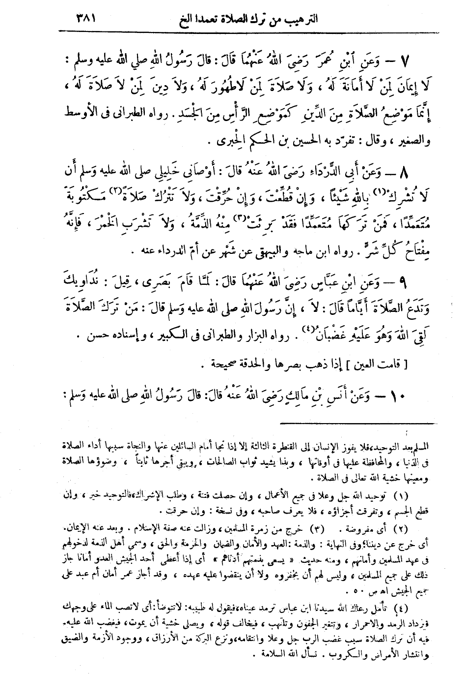 7 - وعن ابن عمر رضي الله عنهما قال: قال رسول الله صلى الله عليه وسلم: لا إيمان لمن لا أمانة له، ولا صلاة لمن لا طهور له، ولا دين لمن لا صلاة له، إنما موضع الصلاة من الدين كموضع الرأس من الجسد. رواه الطبراني في الأوسط والصغير، وقال: تفرّد به الحسين بن الحكم الحِبرى.