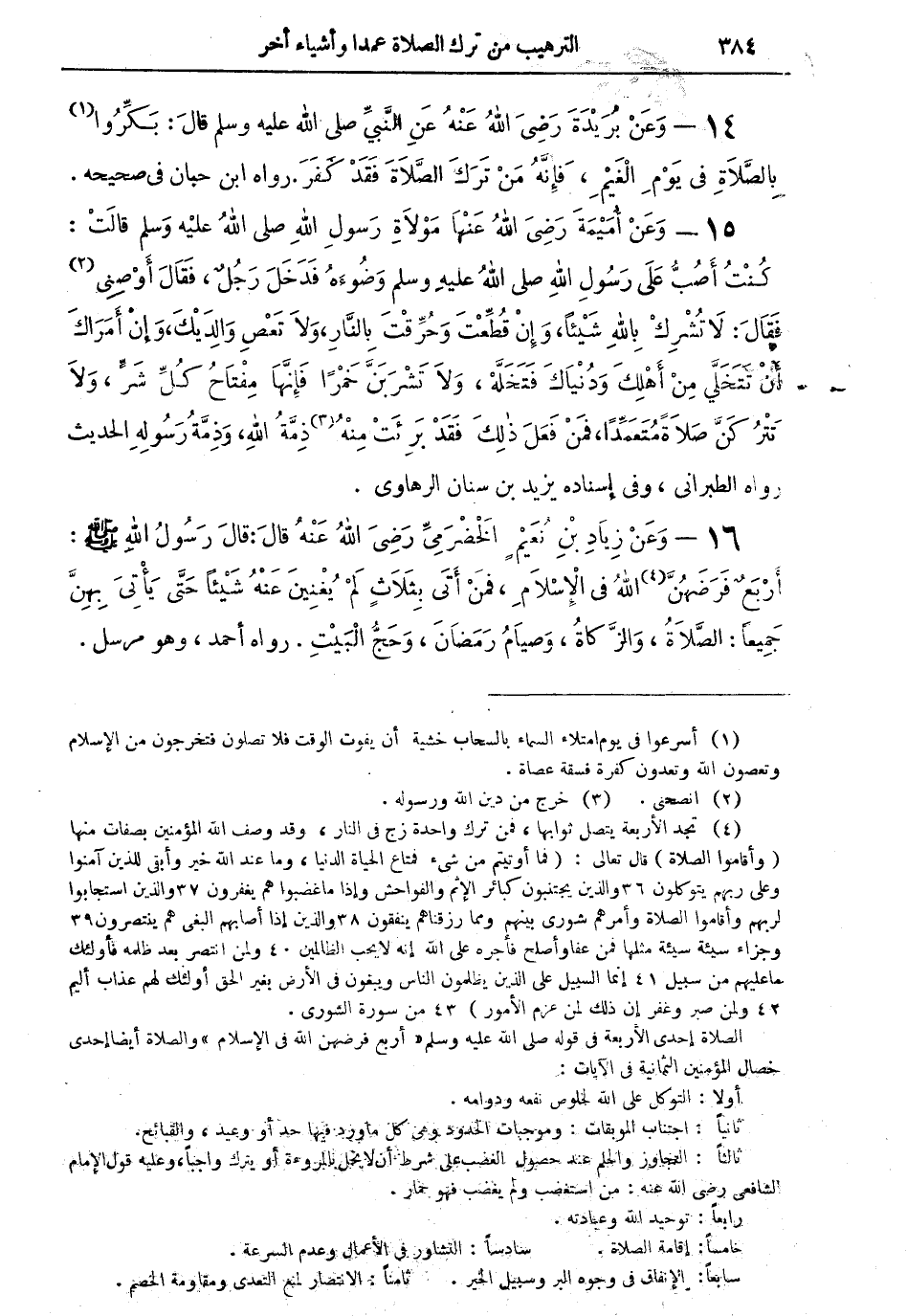 (¬4) تجد الأربعة يتصل ثوابها، فمن ترك واحدة زج في النار، وقد وصف الله المؤمنين بصفات منها (وأقاموا الصلاة) قال تعالى: (فما أوتيتم من شئ فمتاع الحياة الدنيا، وما عند الله خير وأبقى للذين آمنوا وعلى ربهم يتوكلون 36 والذين يجتنبوه كبائر الإثم والفواحش وإذا ما غضبوا هم يغفرون 37 والذين استجابوا لربهم وأقاموا الصلاة وأمرهم شورى بينهم ومما رزقناهم ينفقون 38 والذين إذا أصابهم البغى هم ينتصرون 39 وجزاء سيئة سيئة مثلها فمن عفا وأصلح فأجره على الله إنه لا يحب الظالمين 40 ولمن انتصر بعد ظلمه فأولئك ما عليهم من سبيل 41 إنما السبيل على الذين يظلمون الناس ويبغون في الأرض بغير الحق أولئك لهم عذاب أليم 42 ولمن صبر وغفر إن ذلك لمن عزم الأمور) 43 من سورة الشورى.