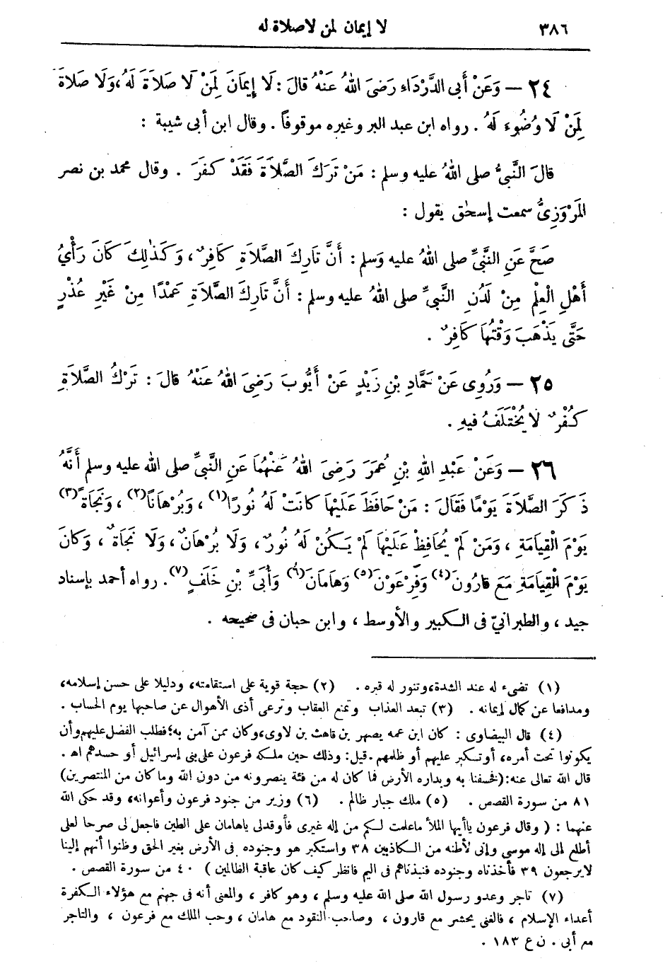 25 - وروى عن حماد بن زيدٍ عن أيوب رضي الله عنه قال: ترك الصلاة كفر لا يُختلف فيه.