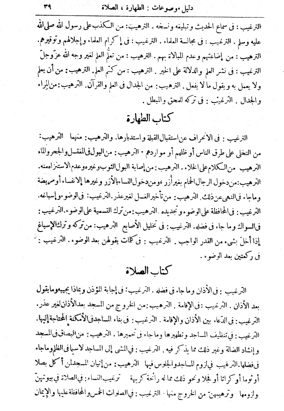 الترغيب: في الانحراف عن استقبال واستدبارها. والترهيب: منهما. الترهيب: من التخلى على طرق الناس أو ظلهم أو مواردهم. الترهيب: من البول في المغتسل والحجر والماء الترهيب: من الكلام على الخلاء. الترهيب: من إصابة بول الثوب وغيره وعدم الاستنزاه منه. الترهيب: من دخول الحمام بغير أُزر، ومن دخول النساء بالأزر وغيرها إلا نفساء أو مريضة وماجاء في النهى عن ذلك. الترهيب: من تأخير الغسل لغير عذر. الترغيب: في الوضوء وإسباغه. الترغيب: في المحافظة على الوضوء وتجديده. الترهيب: من ترك التسمية على الوضوء. الترغيب: في السواك وما جاء في فضله. الترغيب: في تخليل الأصابع. الترهيب: من تركه وترك الإسباغ إذا أخلّ بشئ من القدر الواجب. الترغيب: في كلمات يقولهن بعد الوضوء. الترغيب: في ركعتين بعد الوضوء.