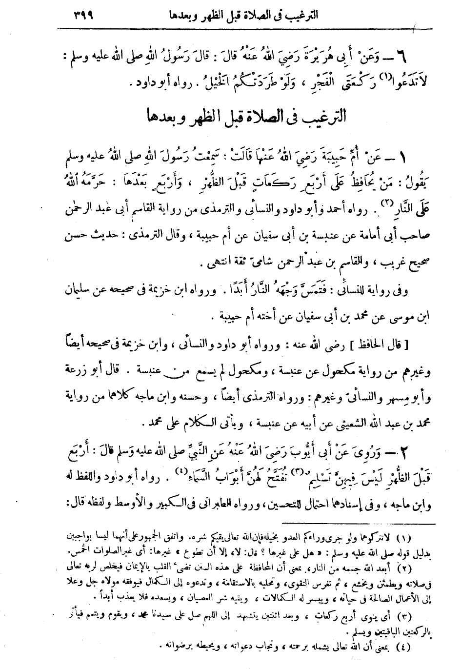 1 - عن أُم حبيبة رضي الله عنها قالت: سمعت رسول الله صلى الله عليه وسلم يقول: من يحافظ على أربع ركعاتٍ قبل الظهر، وأربعٍ بعدها: حرَّمَهُ الله على النار (¬2). رواه أحمد وأبو داود والنسائي والترمذي من رواية القاسم أبى عبد الرحمن صاحب أبى أمامة عن عنبسة بن أبى سفيان عن أم حبيبة، وقال الترمذي: حديث حسن صحيح غريب، والقاسم بن عبد الرحمن شامىّ ثقة انتهى.