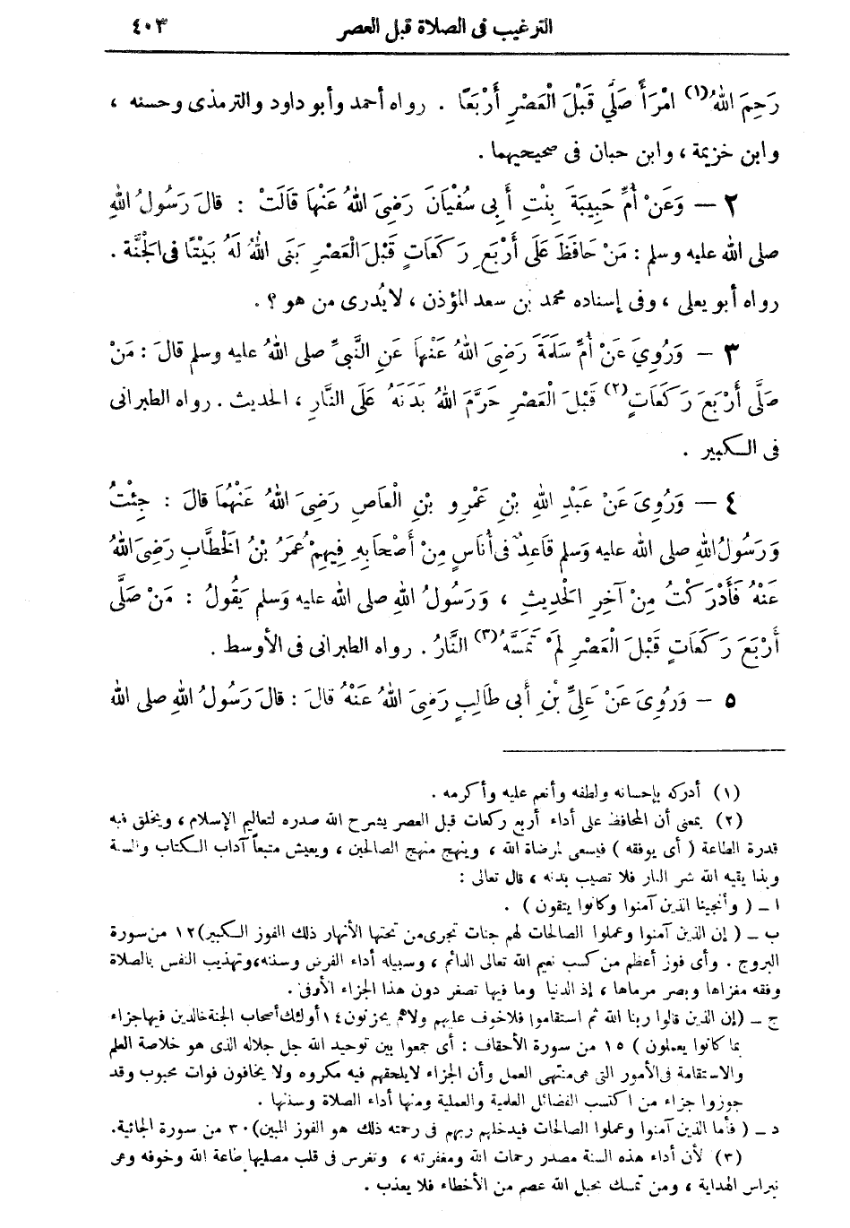 4 - وروى عن عبد الله بن عمرو بن العاص رضي الله عنهما قال: جئت ورسول الله صلى الله عليه وسلم قاعدٌ في أُناسٍ من أصحابه فيهم عمر بن الخطاب رضي الله عنه فأدركت من آخر الحديث، ورسول الله صلى الله عليه وسلم يقول: من صلى أربع ركعات قبل العصر لم تمسه (¬3) النار. رواه الطبراني في الأوسط.