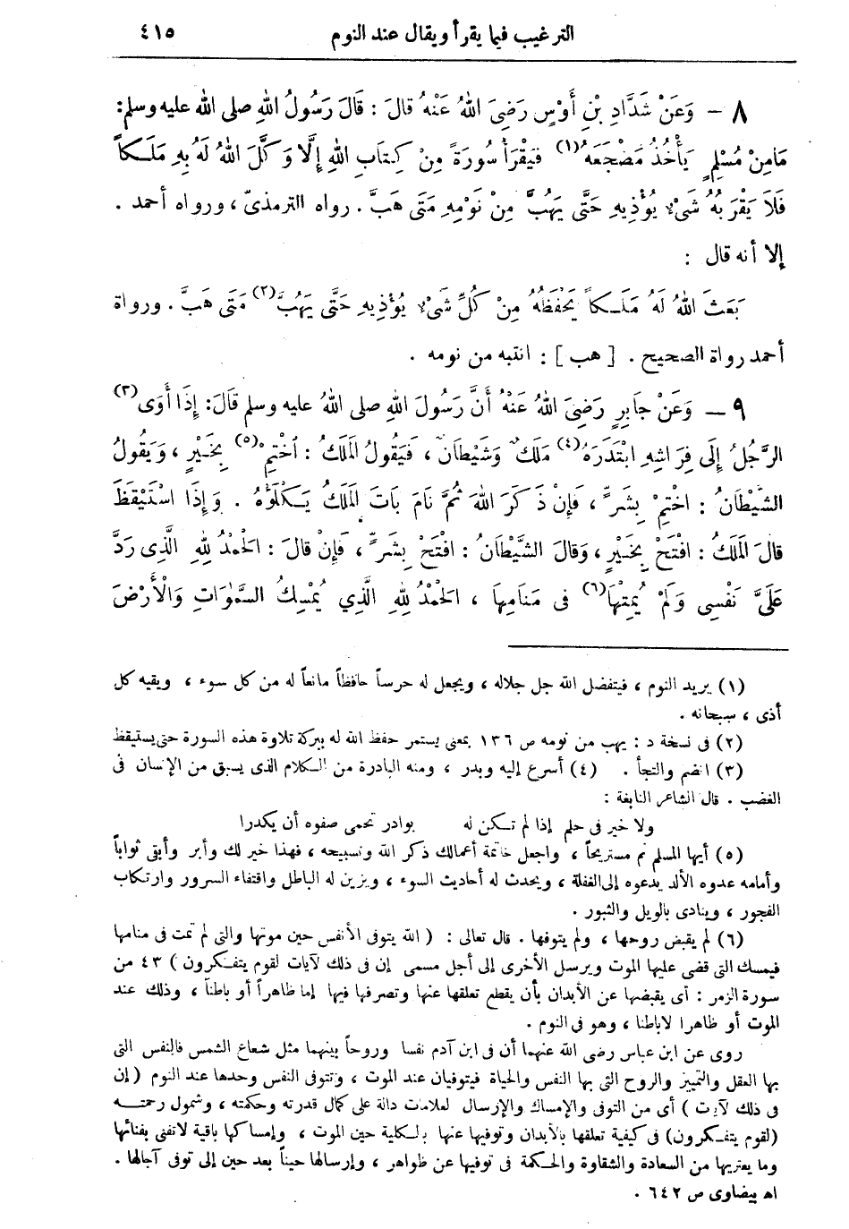 (¬5) أيها المسلم نم مستريحاً، واجعل خاتمة أعمالك ذكر الله وتسبيحه، فهذا خير لك وأبر وأبقى ثواباً وأمامه عدوه الألد يدعوه إلى الغفلة، ويحدث له أحاديث السوء، ويزين له الباطل واقتفاء السرور وارتكاب الفجور، وينادى بالويل والثبور.
