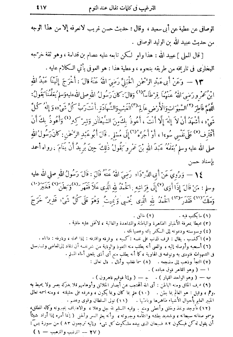 13 - وعن أبي عبد الرحمن الحُبَلِيِّ رضي الله عنه قال: أخرج إلينا عبد الله ابن عمروٍ رضي الله عنهما قرطاساً (¬1) وقال: كان رسول الله صلى الله عليه وسلم يُعلمنا يقول: اللهم فاطر (¬2) السموات والأرض عالم (¬3) الغيب والشهادة. أنت ربُّ كل شئٍ، وإله كل شيءٍ، أشهد أن لا إله إلا أنت، اعوذ بك من الشيطان وشركه (¬4) وأعوذ بك أن أقترف (¬5) على نفسي سُوءاً، أو أجُرَّهُ (¬6) إلى مسلمٍ. قال أبو عبد الرحمن: كان رسول الله صلى الله عليه وسلم يُعلمه عبد الله بن عمروٍ ويقول ذلك حين يريد أن ينام. رواه أحمد بإسناد حسن.