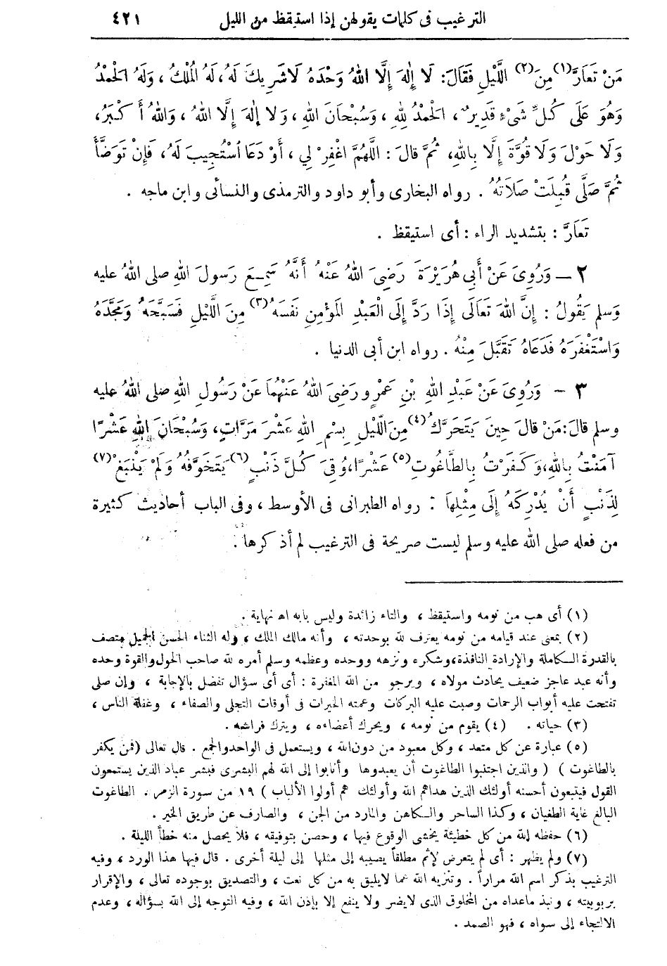 (¬2) بمعنى عند قيامه من نومه يعترف لله بوحدته، وأنه مالك الملك، وله الثناء الحسن الجميل متصف بالقدرة الكاملة والإرادة النفاذة، وشكره ونزهه ووحده وعظمه وسلم أمره لله صاحب الحول والقوة وحده وأنه عبد عاجز ضعيف يحادث مولاه، ويرجو من الله المغفرة: أي أي سؤال تفضل بالإجابة، وإن صلى تفتحت عليه أبواب الرحمات وصبت عليه البركات وعمته الخيرات في أوقات التجلى والصفاء، وغفلة الناس،