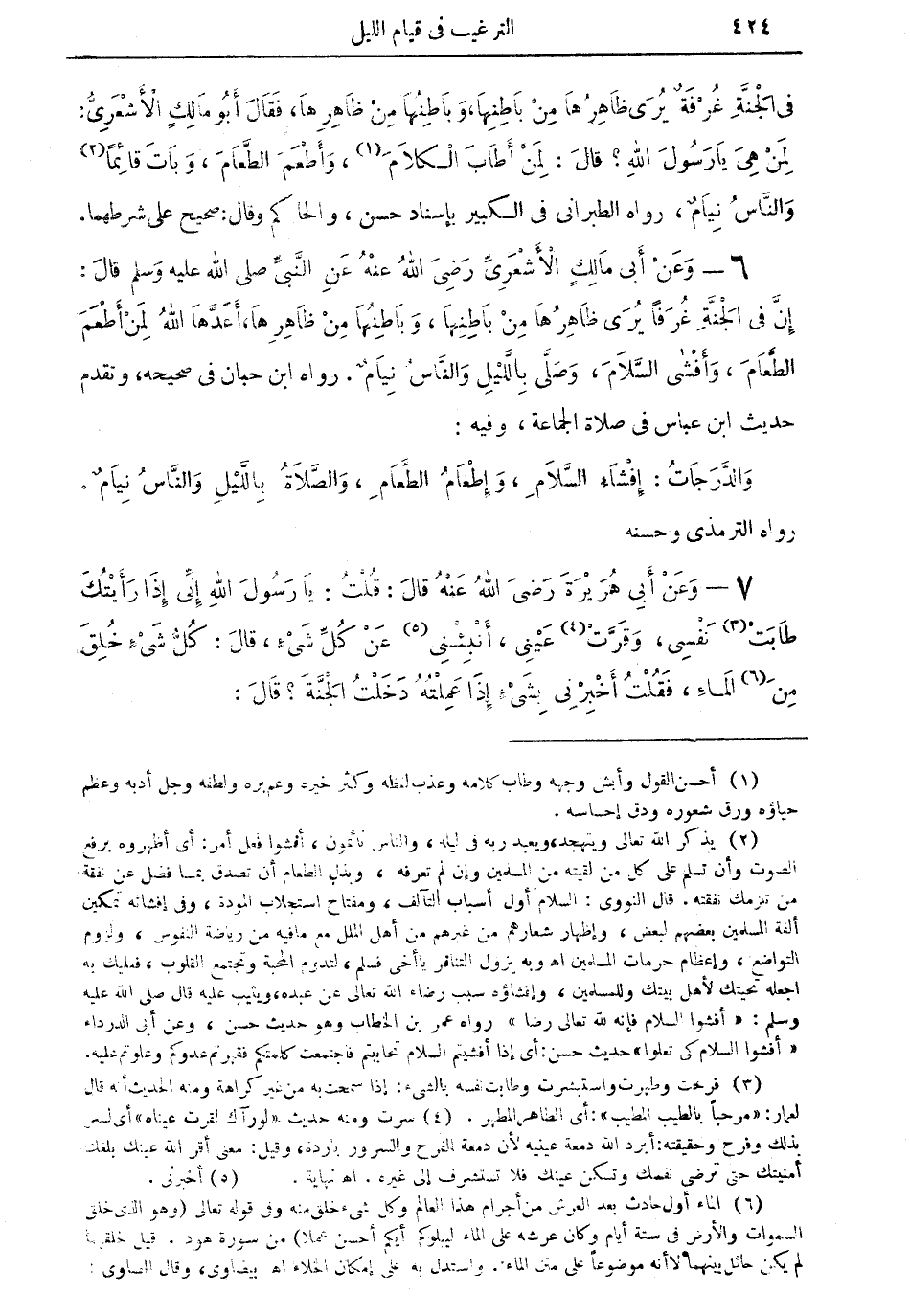 6 - وعن أبي مالكٍ الأشعرى رضي الله عنه عن النبى صلى الله عليه وسلم قال: إن في الجنة غُرفاً يُرى ظاهرها من باطنها، وباطنها من ظاهرها، أعدها الله لمن أطعم الطعام، وأفشى السلام، وصلى بالليل والناس نيام. رواه ابن حبان في صحيحه، وتقدم حديث ابن عباس في صلاة الجماعة، وفيه: