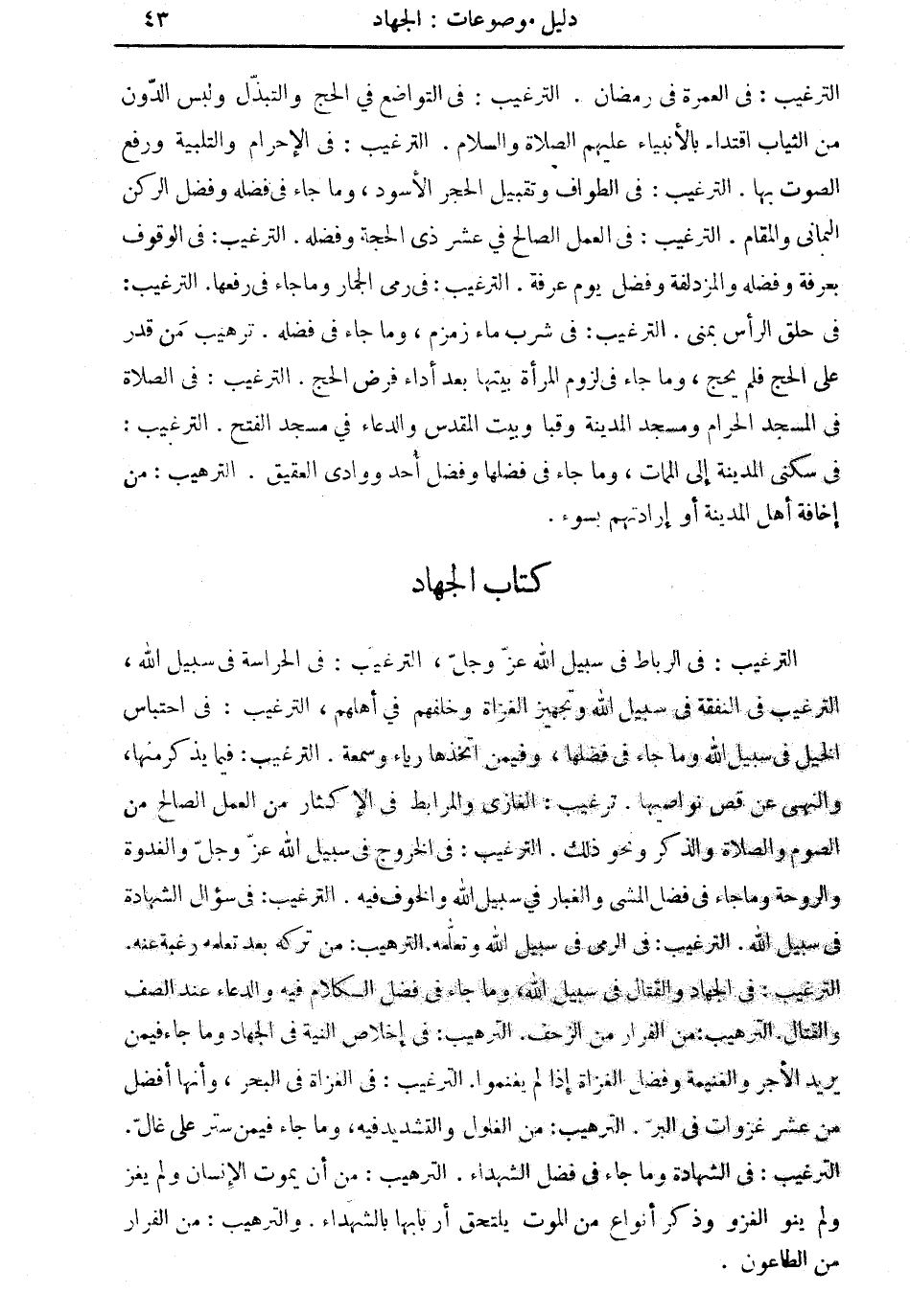 الترغيب: في الرباط في سبيل الله عزّ وجلّ الترغيب: في الحراسة في سبيل الله. الترغيب: في النفقة في سبيل الله وتجهيز الغزاة وخلفهم في أهلهم. الترغيب: في احتباس الخيل في سبيل الله وما جاء فضلها، وفيمن اتخذها رياء وسمعة. الترغيب: فيما يذكر منها، والنهى عن قص نواصيها. ترغيب: الغازى والمرابط في الاكثار من العمل الصالح من الصوم والصلاة والذكر ونحو ذلك، الترغيب: في الخروج في سبيل الله عزّ وجلّ والغدوة والروحة وما جاء في فضل المشى والغبار في سبيل الله والخوف فيه، الترغيب: في سؤال الشهادة في سبيل الله. الترغيب: في الرمى في سبيل الله وتعلُّمه. الترهيب من تركه بعد تعلمه رغبة عنه. الترغيب: في الجهاد والقتال في سبيل الله، وماجاء في فضل الكلام فيه والدعاء عند الصف والقتال. الترهيب: من الفرار من الزحف. الترهيب: في الغزاة في البحر، وأنها أفضل من عشر غزوات البرّ. الترهيب: من الغلول والتشديد فيه، وما جاء فيمن ستر على غالّ. الترغيب: في الشهادة وما جاء في فضل الشهداء. الترهيب: من أن يموت الإنسان ولم يغز ولم ينو الغزو وذكر أنواع من الموات يلتحق أربابها بالشهداء. والترهيب: من الفرار من الطاعون