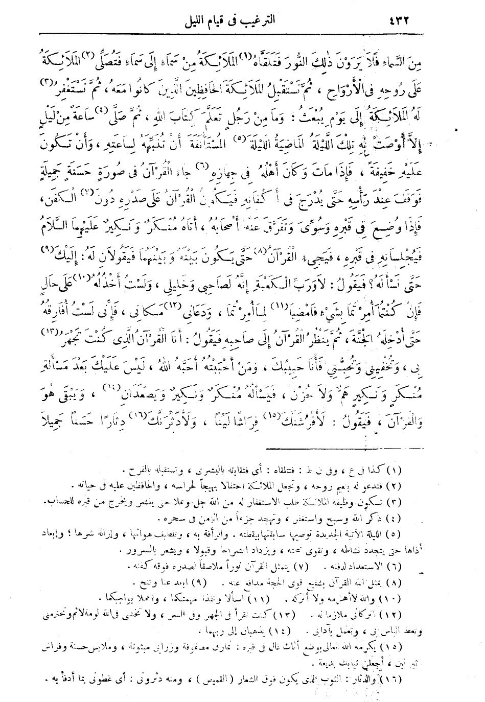 له الملائكة إلى يوم يُبعث؛ وما من رجلٍ تعلم كتاب الله، ثم صلى (¬4) ساعةً من ليلٍ إلا أوصت به تلك الليلة الماضية الليلة (¬5) المستأنفة أن تنبهه لساعته، وأن تكون عليه خفيفةً، فإذا مات وكان أهله في جهازه (¬6) جاء القرآن في صورةٍ حسنةٍ جميلةٍ فوقف عند رأسه حتى يدرج في أكفانه فيكون القرآن على صدره دون (¬7) الكفن، فإذا وُضِعَ في قبره، فيجئُ القرآن (¬8) حتى يكون بينه وبينهما فيقولان له: إليك (¬9) حتى نسأله؟ فيقول: لا ورب الكعبة إنه لصاحبى وخليلى، ولستُ أخذله (¬10) على حالٍ فإن كنتما أُمرتما بشئٍ فامضيا (¬11) لما أُمرتما، ودعانى (¬12) مكانى، فإنى لست أُفارقه حتى أُدخله الجنة، ثم ينظر القرآن إلى صاحبه فيقول: أنا القرآن الذى كنت تجهر (¬13) بى، وتُخفينى وتُحبُّنى فأنا حبيبك، ومن أحببته أحبه الله، ليس عليك بعد مسألة منكرٍ ونكيرٍ هم ولا حُزنٌ، فيساله منكر ونكيرٌ ويصعدان (¬14)، ويبقى هو والقرآن، فيقول: لأفرشنك (¬15)