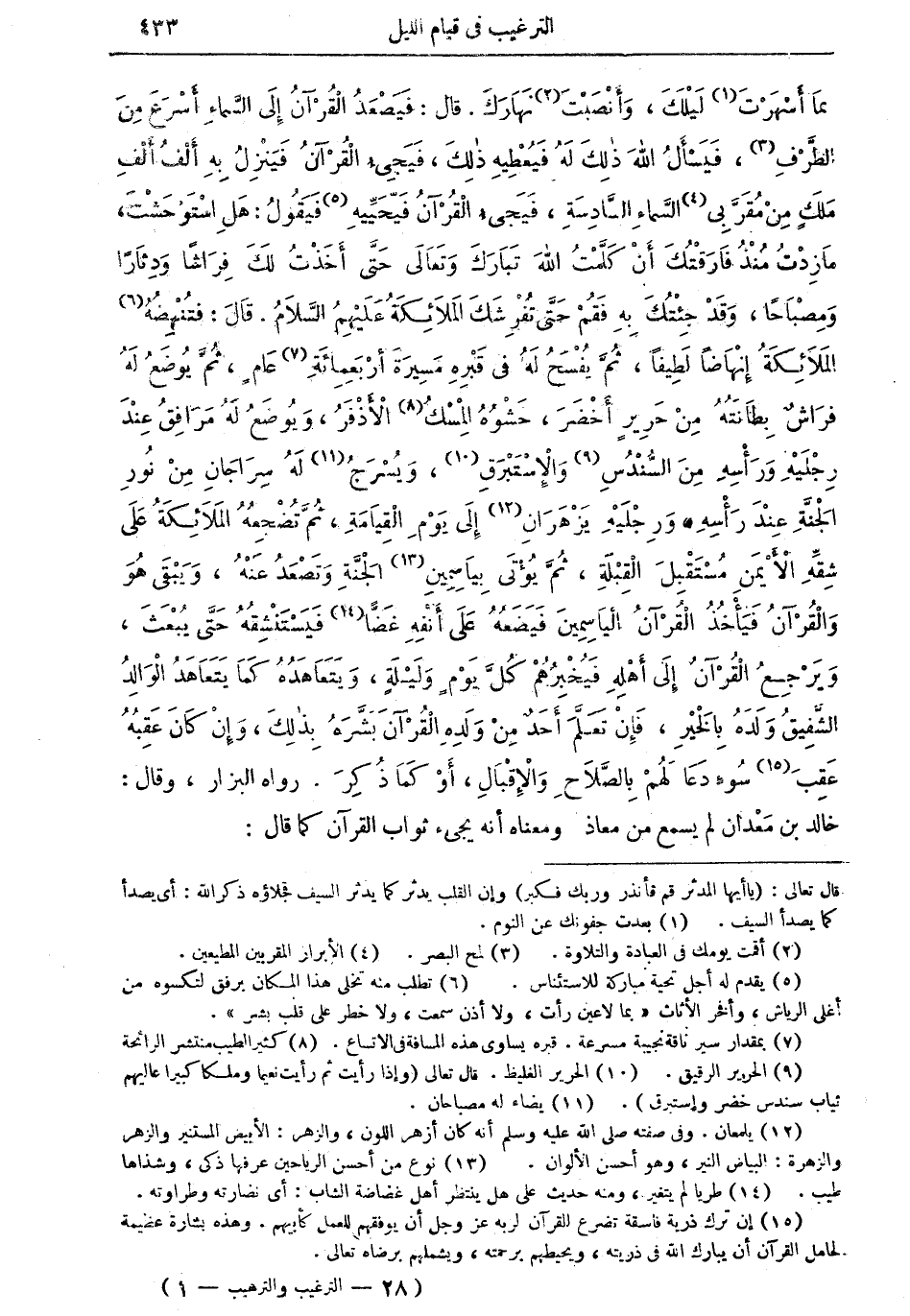 بما أسهرت (¬1) ليلك، وأنصبت (¬2) نهارك. قال: فيصعد القُرآن إلى السماء أسرع من الطرف (¬3)، فيسأل الله ذلك له فيعطيه ذلك، فيجئُ القرآن فينزلُ به ألف ألف ملكٍ من مُقرَّبى (¬4) السماء السادسة، فيجيءُ القرآن فيحييه (¬5) فيقول: هل استوحشت، مازدت منذ فارقتك أن كلمت الله تبارك وتعالى حتى أخذت لك فراشاً ودثاراً ومصباحاً، وقد جئتك به فقم حتى تفرشك الملائكة عليهم السلام. قال: فتنهضه (¬6) الملائكة إنهاضاً لطيفاً، ثم يفُسحُ له في قبره مسيرة أربعمائه (¬7) عام، ثم يُوضعُ له فراش بطانته من حريرٍ أخضر، حشوه المسك (¬8) الأذفر، ويوضع له مرافق عند رجليه ورأسه من السندس (¬9) والإستبرق (¬10)، ويُسرجُ (¬11) له سِراجان من نور الجنة عند رأسه، ورجليه يزهران (¬12)