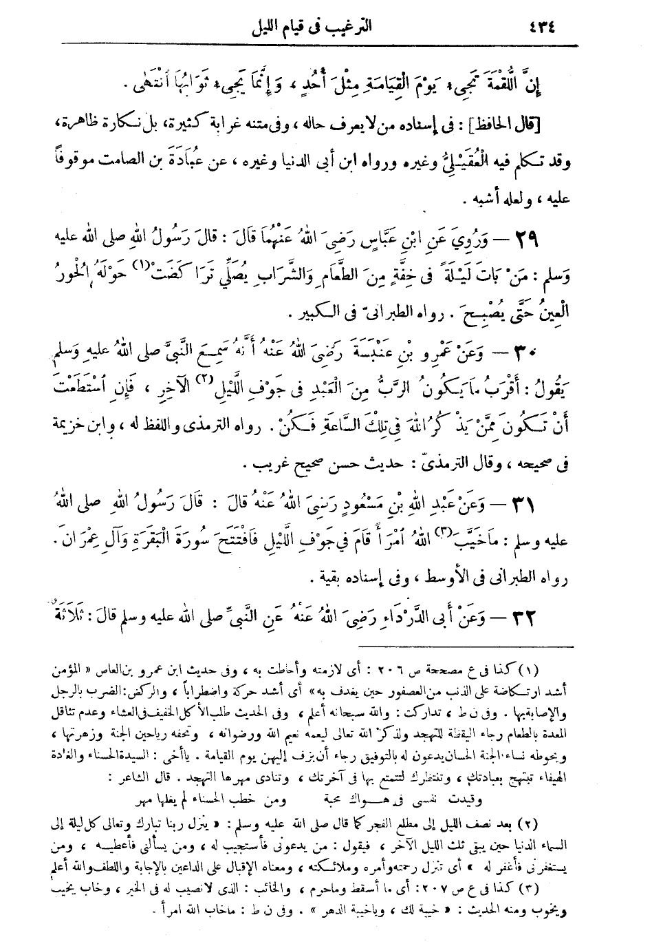 31 - وعن عبد الله بن مسعودٍ رضي الله عنه قال: قال رسول الله صلى الله عليه وسلم: ما خيب (¬3) الله امرأً قام في جوف الليل فافتتح سورة البقرة وآل عمران. رواه الطبراني في الأوسط، وفي إسناده بقية.
