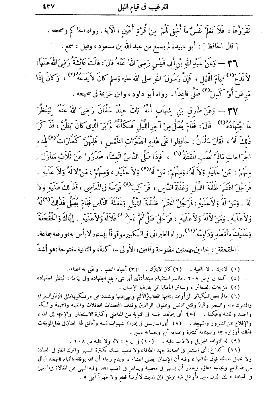 37 - وعن طارق بن شهاب أنه بات عند سلمان رضي الله عنه لينظر ما اجتهاده (¬4). قال: فقام يصلى من آخر الليل فكأنه لم ير الذى كان يظن، فذكر ذلك له، فقال سلمان: حافظوا على الصلوات الخمس، فإنهن كفاراتٌ (¬5) لهذه الجراحات ما لم تُصب المقتلة (¬6)، فإذا صلى الناس العشاء صدروا عن ثلاث منازل. منهم: من عليه ولا له، ومنهم: من له (¬7) ولا عليه، ومنهم: من لا له ولا عليه. فرجلٌ اغتنم ظلمة الليل وغفلة الناس، فركب (¬8) فرسه في المعاصى، فذلك عليه ولا له. ومن له ولا عليه: فرجل اغتنم ظلمة الليل وغفلة الناس فقام يصلى فذلك (¬9) له ولا عليه. ومن لا له ولا عليه: فرجل صلى ثم نام (¬10) فلا ولا عليه. إياك والحقحقة وعليك بالقصد وداومه (¬11).