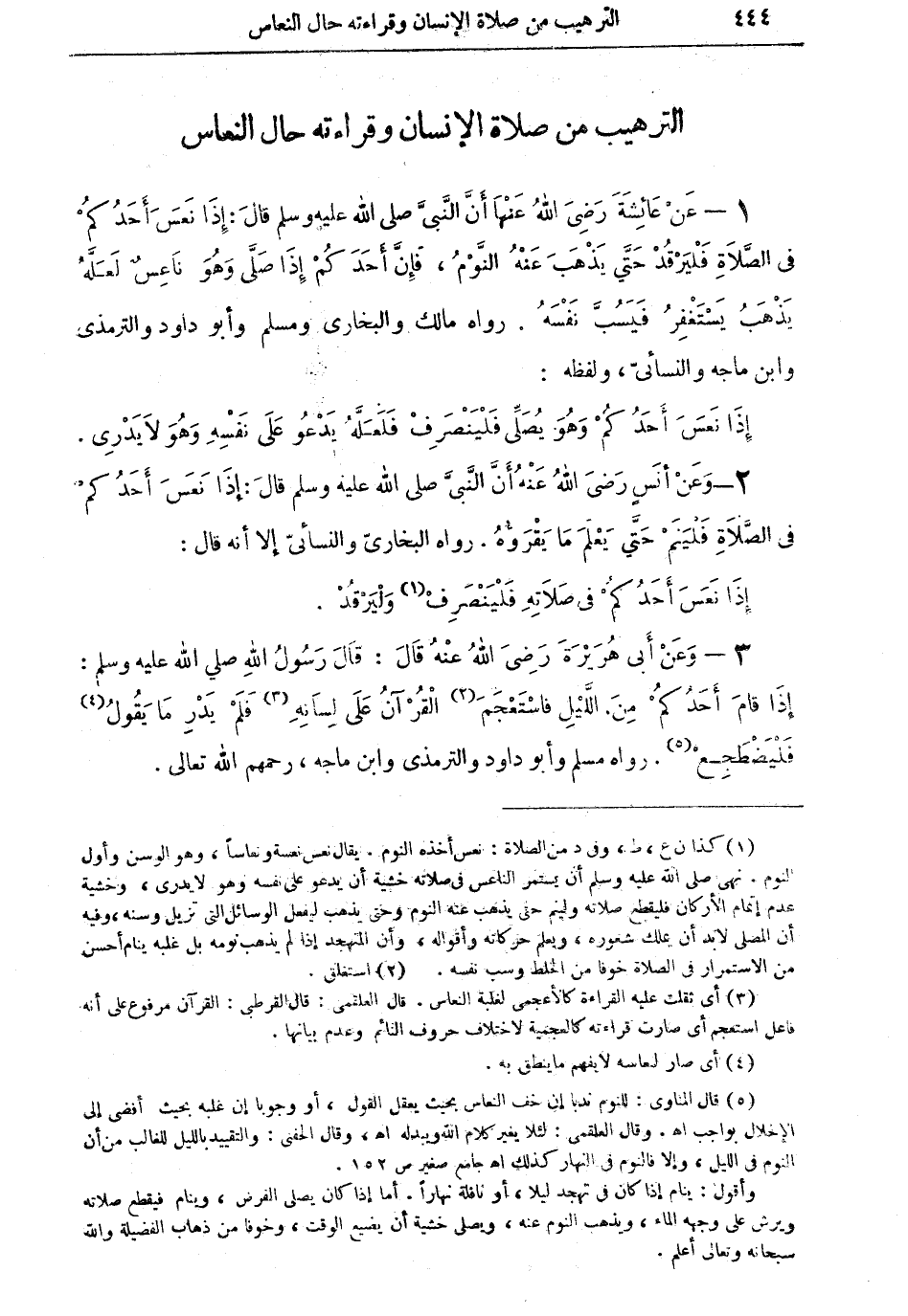 1 - عن عائشة رضي الله عنها أن النبى صلى الله عليه وسلم قال: إذا نعس أحدكم في الصلاة فليرقد حتى يذهب عنه النوم، فإن أحدكم إذا صلى وهو ناعسٌ لعله يذهب يستغفر فيسب نفسه. رواه مالك والبخاري ومسلم وأبو داود والترمذي وابن ماجه والنسائي، ولفظه: