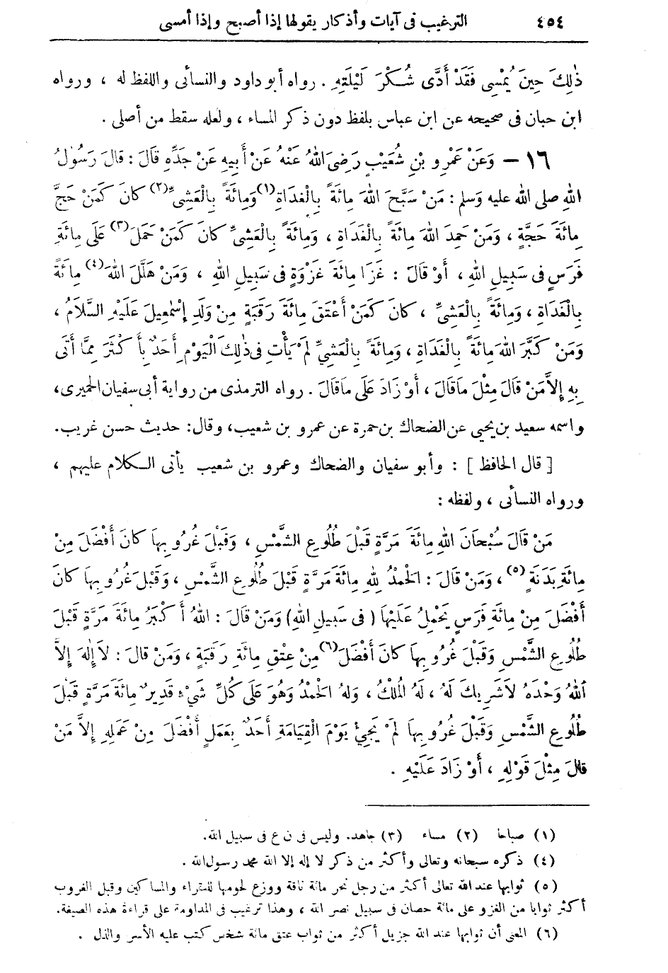 16 - وعن عمرو بن شعيب رضي الله عنه عن أبيه عن جده قال: قال رسول الله صلى الله عليه وسلم: من سبح الله مائةً بالغداة (¬1) ومائة بالعشىِّ (¬2) كان كمن حج مائة حجةٍ، ومن حمد الله مائةً بالغداةِ، ومائةً بالعشى كان كمن حمل (¬3) على مائة فرسٍ في سبيل الله، أو قال: غزا مائة غزوةٍ في سبيل الله، ومن هلل الله (¬4) مائة بالغداة، ومائة بالعشى، كان كمن أعتق مائة رقبةٍ من ولد إسماعيل عليه السلام، ومن كبر الله مائة بالغداة، ومائة بالعشى لم يأْتِ في ذلك اليوم أحدٌ بأكثر مما أتى به إلا من قال مثل ما قال، أو زاد على ما قال. رواه الترمذي من رواية أبى سفيان الحميرى، واسمه سعيد ابن يحيى عن الضحاك بن حمرة عن عمرو بن شعيب، وقال: حديث حسن غريب.