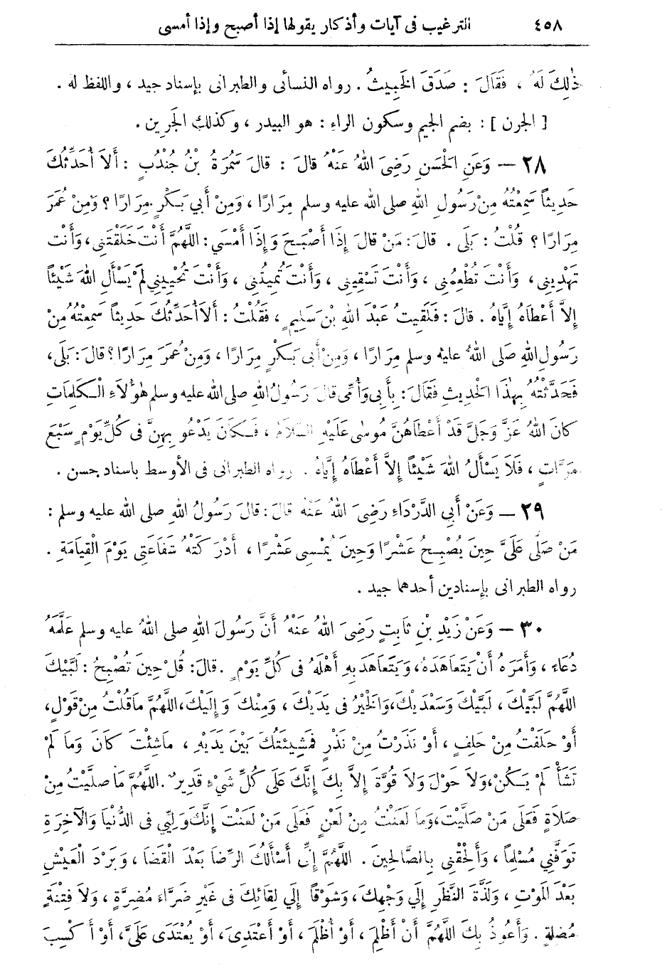30 - وعن زيد بن ثابت رضي الله عنه أن رسول الله صلى الله عليه وسلم علمه دعاء، وأمره أن يتعاهد به أهله في كل يومٍ. قال: قل حين تصبح: لبيك اللهم لبيك، لبيك وسعديك، والخير في يديك، ومنك وإليك اللهم ما قلت من قولٍ، أو حلفت من حلفٍ، أو نذرت من نذرٍ فمشيئتك بين يديه، ما شئت كان وما لم تشأ لم يكن، ولا حول ولا قوة إلا بك إنك على كل شئ قديرٌ. اللهم ما صليت من صلاةٍ فعلى من صليت، وما لعنت من لعنٍ فعلى من لعنت إنك ولِّي في الدنيا والآخرة توفنى مسلماً، وألحقنى بالصالحين. اللهم إنى أسألك الرضا بعد القضا، وبرد العيش بعد الموت، ولذة النظر إلى وجهك، وشوقاً إلى لقائك في غير ضرَّاءَ مُضرَّةٍ، ولا فتنةٍ مُضِلةٍ. وأعوذ بك اللهم أن أظلم، أو أُظلم، أو أعتدى، أو يُعتدى علىَّ، أو أكسبَ