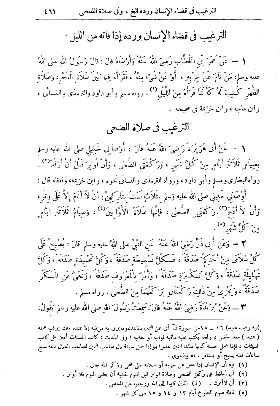 1 - عن عمر بن الخطاب رضي الله عنه وأرضاه قال: قال رسول الله صلى الله عليه وسلم: من نام عن حزبه، او شئ منه، فقرأه فما بين صلاة الفجر، وصلاة الظهر كُتب له كأنما قرأه من الليل (¬1). رواه مسلم وأبو داود والترمذي والنسائي، وابن ماجه، وابن خزيمة في صحيحه.