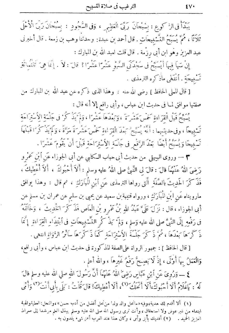 3 - وروى البيهقى من حديث أبى حباب الكلبي عن أبي الجوزاء عن ابن عمروٍ رضي الله عنهما قال: قال لى النبى صلى الله عليه وسلم: ألا أحبوك، ألا أُعطيك، فذكر الحديث بالصفة التى رواها الترمذي عن ابن المبارك، ثم قال: وهذا يوافق ما رويناه عن ابن المبارك، ورواه قتيبة بن سعيد عن يحيى بن سليم عن عمران بن مسلم عن أبي الجوزاء، قال: نزل على عبد الله بن عمرو بن العباص فذكر الحديث، وخالفه في رفعه إلى النبى صلى الله عليه وسلم، ولم يذكر التسبيحات في ابتداء القراءة إنما ذكرها بعدها، ثم ذكر جلسة الاستراحة كما ذكرها سائرُ الرواة انتهى.