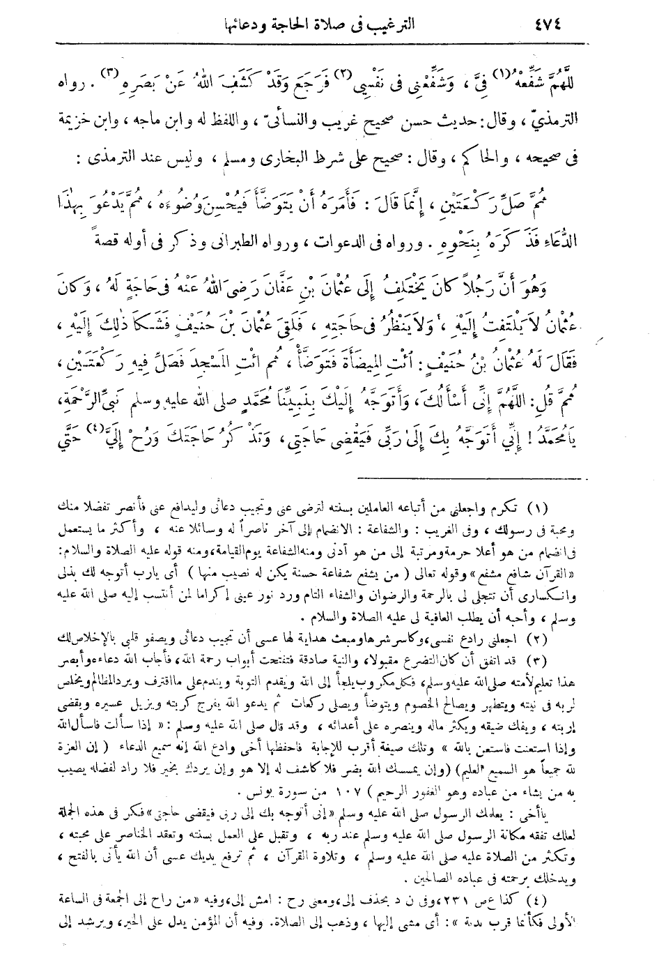 وهو أن رجلاً كان يختلف إلى عثمان بن عفان رضي الله عنه في حاجةٍ له، وكان عثمان لايلتفت إليه، ولا ينظر في حاجته، فلقى عثمان بن حنيفٍ فشكا ذلك إليه، فقال له عثمان بن حنيفٍ: ائت الميضأة فتوضأ، ثم ائت المسجد فصل فيه ركعتين، ثم قل: اللهم إنى أسألك، وأتوجه إليك بنبينا محمد صلى الله عليه وسلم نبى الرحمة، يا محمد! إنى أتوجه بك إلى ربى فيقضى حاجتى، وتذكر حاجتك ورح إلىَّ (¬4) حتى