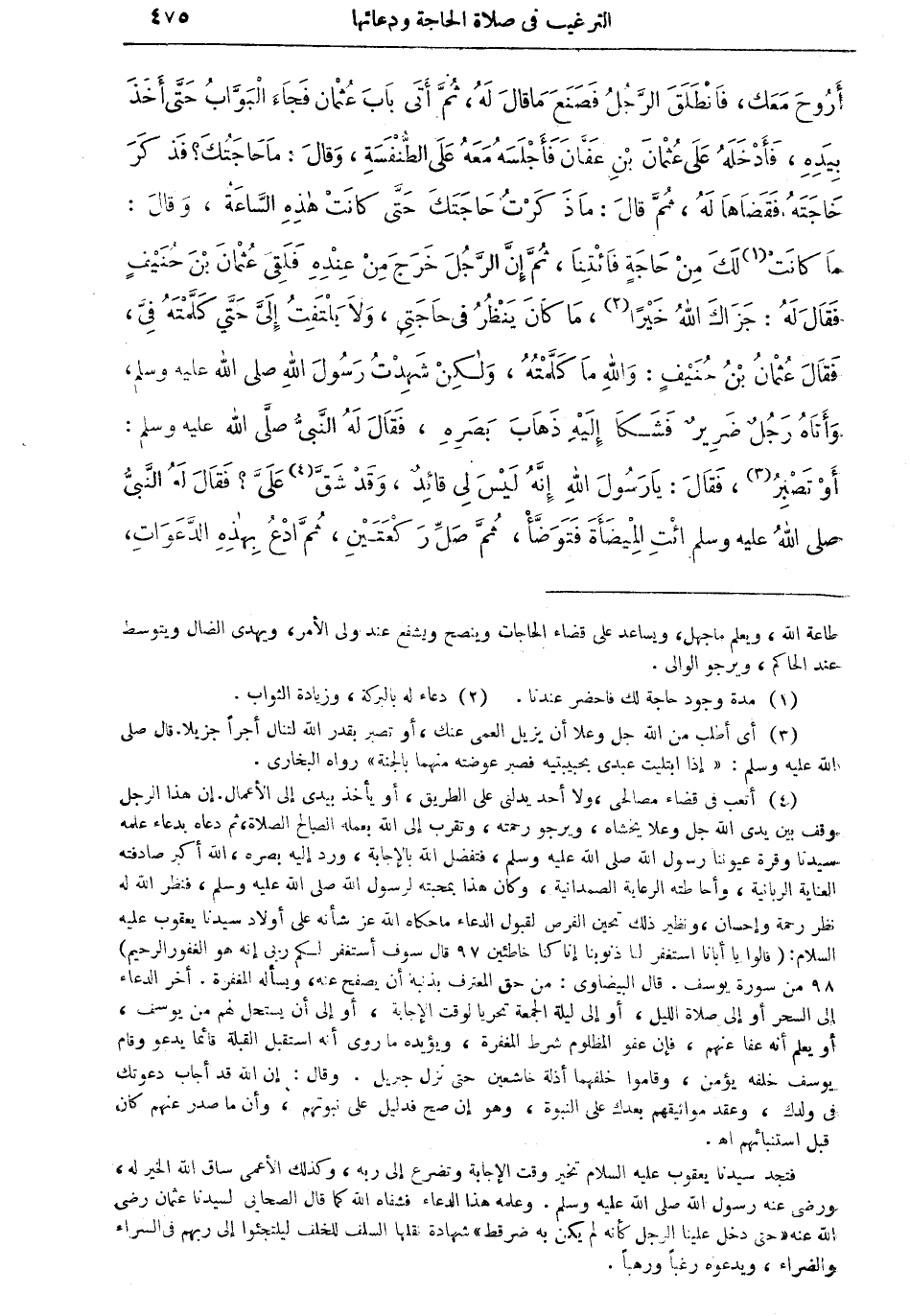 (¬4) أتعب في قضاء مصالحى، ولا أحد يدلنى على الطريق، أو يأخذ بيدى إلى الأعمال .. إن هذا الرجل وقف بين يدى الله جل وعلا يخشاه، ويرجو رحمته، وتقرب إلى الله بعمله الصالح، ثم دعاه بدعاء علمه سيدنا وقرة عيوننا رسول الله صلى الله عليه وسلم، فتفضل الله بالإجابة، ورد إليه بصره، الله أكبر صادفته العناية الربانية، وأحاطته الرعاية الصمدانية، وكان هذا بمحبته لرسول الله صلى الله عليه وسلم، فنظر الله له نظر رحمة وإحسان، ونظر ذلك تحين الفرص لقبول الدعاء ما حكاه الله عز شأنه على أولاد سيدنا يعقوب عليه السلام: (قالوا يا أبانا استغفر لنا ذنوبنا إنا كنا خاطئين 97 قال سوف أستغفر لكم ربى إنه هو الغفور الرحيم) 98 من سورة يوسف. قال البيضاوى: من حق المعترف بذنبه أن يصفح عنه، ويسأله المغفرة. أخر الدعاء إلى السحر أو إلى صلاة الليل، أو إلى ليلة الجمعة تحريا لوقت الإجابة، أو إلى أن يستحل لهم من يوسف، أو يعلم أنه عفا عنهم، فإن عفو المظلوم شرط المغفرة، ويؤيده ماروى أنه استقبل القبلة قائما يدعو وقام يوسف خلفه يؤمن، وقاموا خلفها أذلة خاشعين حتى نزل جبريل. وقال: إن الله قد أجاب دعوتك في ولدك، وعقد مواثيقهم بعدك على النبوة، وهو إن صح فدليل على نبوتهم، وأن ما صدر عنهم كان قبل استنبائهم أهـ.