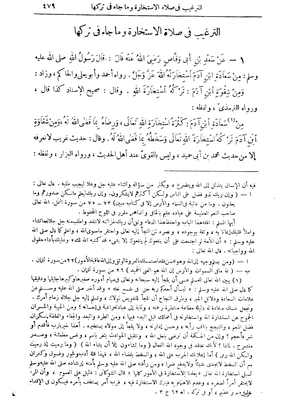 1 - عن سعد بن أبى وقاصٍ رضي الله عنه قال: قال رسول الله صلى الله عليه وسلم: من سعادةِ ابن آدم استخارته الله عز وجل. رواه أحمد وأبو يعلى والحاكم، وزاد: ومن شقوةِ ابن آدم: تركه استخارة الله. وقال: صحيح الإسناد كذا قال، ورواه الترمذي، ولفظه: