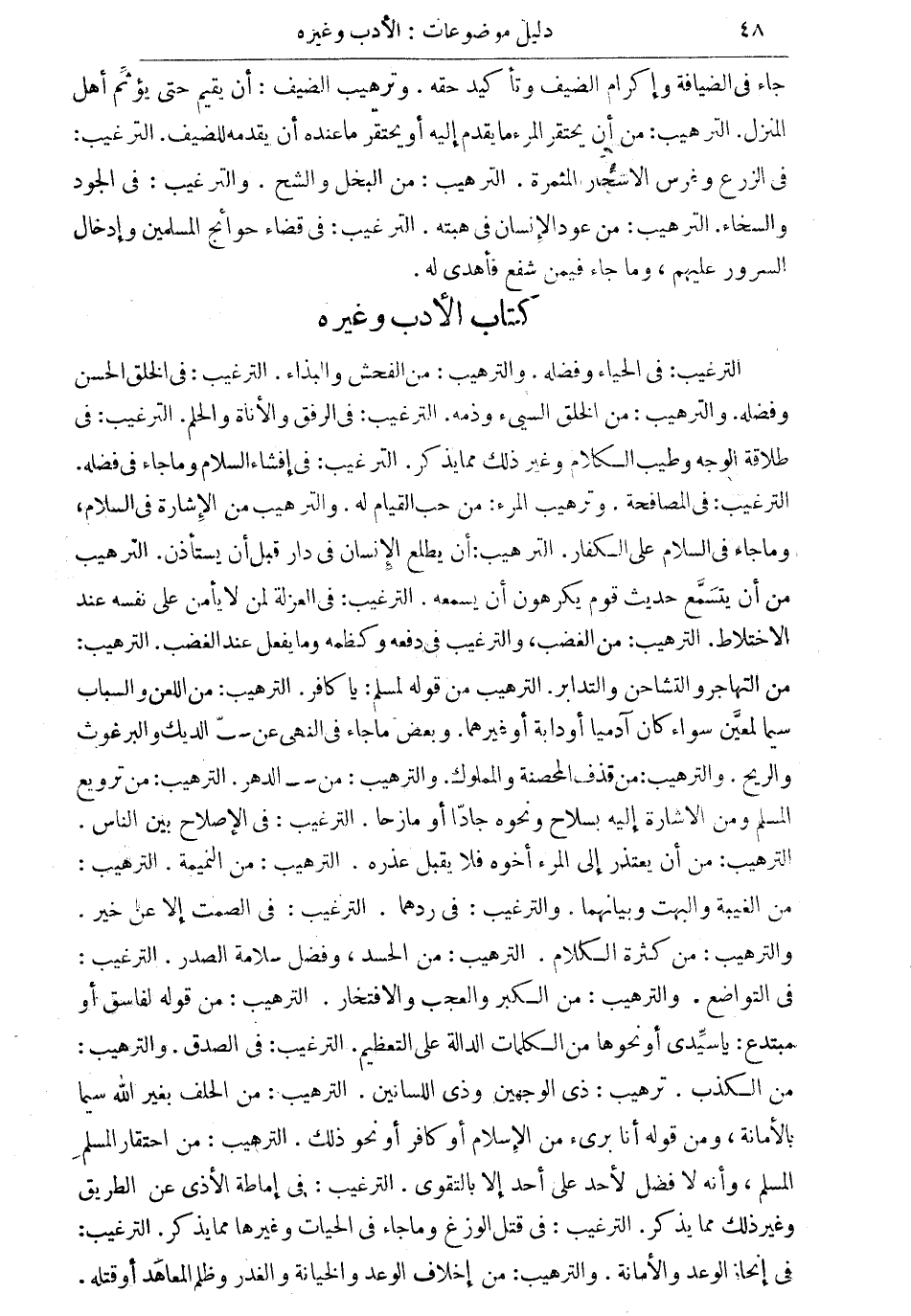 الترغيب: في الحياء وفضله. والترهيب: من الفحش والبذاء. الترغيب: في الخلق الحسن وفضله. والترهيب: من الخلق السيء وذمه. الترغيب: في الرفق والأناءة والحلم. الترغيب: في طلاقة الوجه وطيب الكلام وغير ذلك مما يذكر. الترغيب: في إفشاء السلام وما جاء في فضله. الترغيب: في المصافحة. وترهيب المرء: من حب القيام له. والترهيب: من الإشارة في السلام، وماجاء في السلام على الكفار. الترهيب أن يطلع الإنسان في دار قبل أن يستأذن. الترهيب من أن يتسَمَّع حديث قوم يكرهون أن يسمعه. الترغيب: في العزلة لمن لا يأمن على نفسه عند الاختلاط. الترهيب: من الغضب، والترغيب في دفعه وكظمه وما يفعل عند الغضب. الترهيب من التهاجر والتشاحن والتدابر. الترهيب من قوله لمسلم: يا كافر. الترهيب: من اللعن والسباب سيما لمعيَّن سواء كان آدميا أو دابة أو غيرهما. وبعض ماجاء في النهى عن سبّ الديك والبرغوث والريح. والترهيب: من قذف المحصنة والمملوك. الترهيب: من سب الدهر. الترهيب: من ترويع المسلم ومن الاشارة إليه بسلاح ونحو جادّا أو مازحا. الترغيب: في الاصلاح بين الناس. الترهيب: من أن يعتذر والبهت وبيانهما. والترغيب: من الحسد. وفضل سلامة الصدر. الترغيب فى التواضع. والترهيب: من الكبر والعجب والافتخار. الترهيب: من قوله لفاسق أو مبتدع: يا سيِّدى أو نحوها من الكلمات الدالة على التعظيم. الترغيب: في الصدق. والترهيب: من الكذب. ترهيب: ذى الوجهين وذى اللسانين. الترهيب: من الحلف بغير الله سيمان بالأمانة، ومن قوله أنا برئ من الاسلام أو كافر أو نحو ذلك. الترهيب: من احتقار المسلمِ المسلمَ وأنه لا فضل لأحد على أحد إلا بالتقوى. الترغيب: في إماطة الأذى عن الطريق وغير ذلك مما يذكر. الترغيب: في قتل الوزغ وما جاء في الحيات وغيرها مما يذكر. الترغيب فى إنجاز الوعد والأمانة. والترهيب: من إخلاف الوعد والخيانة والغدر وظلم المعاهَد أو قتله.