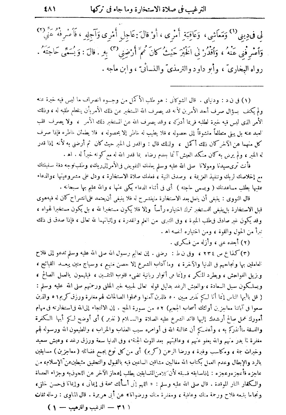 ومعاشى، وعاقبة أمرى، أو قال: عاجل أمرى وآجله، فاصرفه عنى (¬2) واصرفنى عنه، واقدر لى الخير حيث كان ثم أرضنى (¬3) به. قال: ويُسمِّى حاجته. رواه البخاري، وأبو داود والترمذي والنسائي، وابن ماجه.
