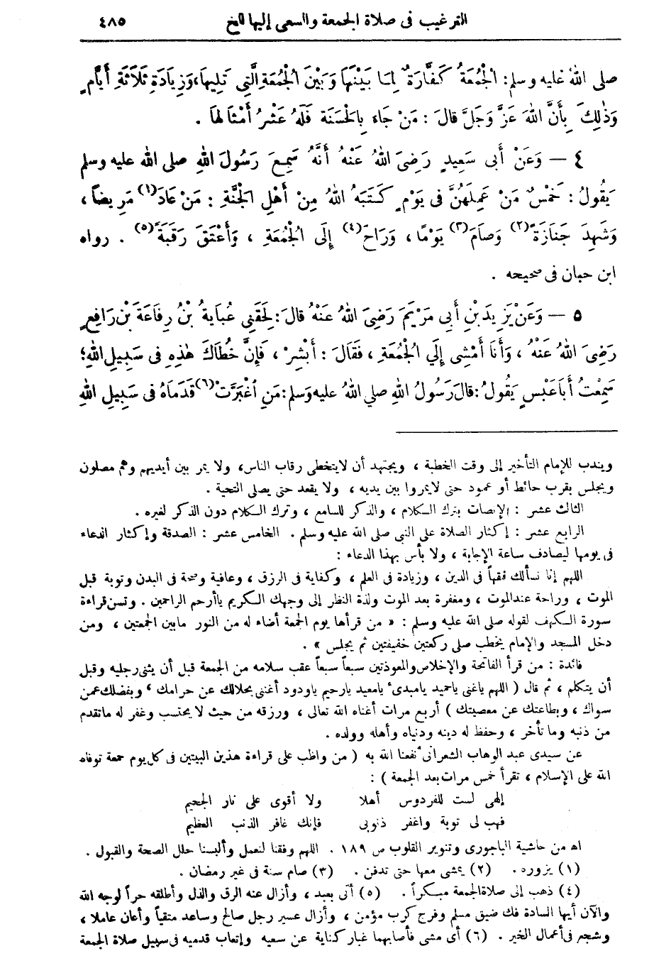 اللهم إنا نسألك فقهاً في الدين، وزيادة في العلم، وكفاية في الرزق، وعافية وصحة في البدن وتوبة قبل الموت، وراحة عند الموت، ومغفرة بعد الموت ولذة النظر إلى وجهك الكريم يا أرحم الراحمين. وتسن قراءة سورة الكهف لقوله صلى الله عليه وسلم: (من قرأها يوم الجمعة أضاء له من النور ما بين الجمعتين، ومن دخل المسجد والإمام يخطب صلى ركعتين خفيفتين ثم يجلس).