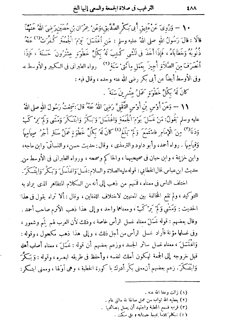 11 - وعن أوس بن أوسٍ الثقفى رضي الله عنه قال: سمعت رسول الله صلى الله عليه وسلم يقول: من غسل يوم الجمعة واغتسل وبكرَ وابتكر ومشى ولم يركب ودنا (¬3) من الإمام فاستمع ولم يلغ (¬4) كان له بكل خطوةٍ عمل سنةٍ أجرُ صيامها وقيامها. رواه أحمد، وأبو داود والترمذي، وقال: حديث حسن، والنسائيّ وابن ماجه، وابن خزيمة، وابن حبان في صحيحيهما، والحاكم وصححه، ورواه الطبراني في الأوسط من حديث ابن عباس: قال الخطابي: قوله عليه الصلاة والسلام: غسل واغتسل وبكر وابتكر.