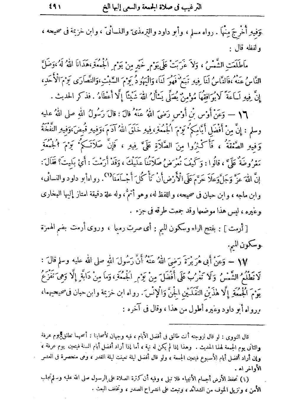 17 - وعن أبي هريرة رضي الله عنه أن رسول الله صلى الله عليه وسلم قال: لا تطلع الشمس ولا تغرب على أفضل من يوم الجمعة، وما من دابة إلا وهى تفزع يوم الجمعة إلا هذين الثقلين الجن والإنس. رواه ابن خزيمة وابن حبان في صحيحيهما، ورواه أبو داود وغيره أطول من هذا، وقال في آخره: