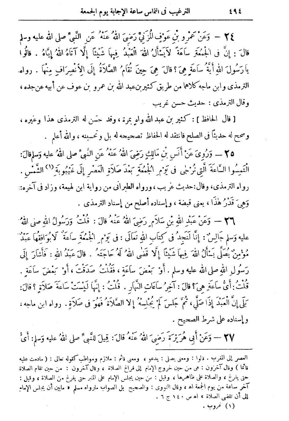 26 - وعن عبد الله بن سلامٍ رضي الله عنه قال: قلت ورسول الله صلى الله عليه وسلم جالسٌ: إنا لنجدُ في كتاب الله تعالى: في يوم الجمعة ساعةٌ لا يوافقها عبدٌ مؤمنٌ يصلى يسأل الله فيها شيئاً إلا قضى الله له حاجته. قال عبد الله: فأشار إلى رسول الله صلى الله عليه وسلم. أو بعض ساعةٍ، فقلت صدقت، أو بعض ساعةٍ. قلت: أي ساعةٍ هى؟ قال: آخر ساعات النهار. قلت: إنها ليست ساعة صلاةٍ؟ قال: بلى إن العبد إذا صلى، ثم جلس لم يجلسه إلا الصلاة فهو في صلاةٍ. رواه ابن ماجه، وإسناده على شرط الصحيح.