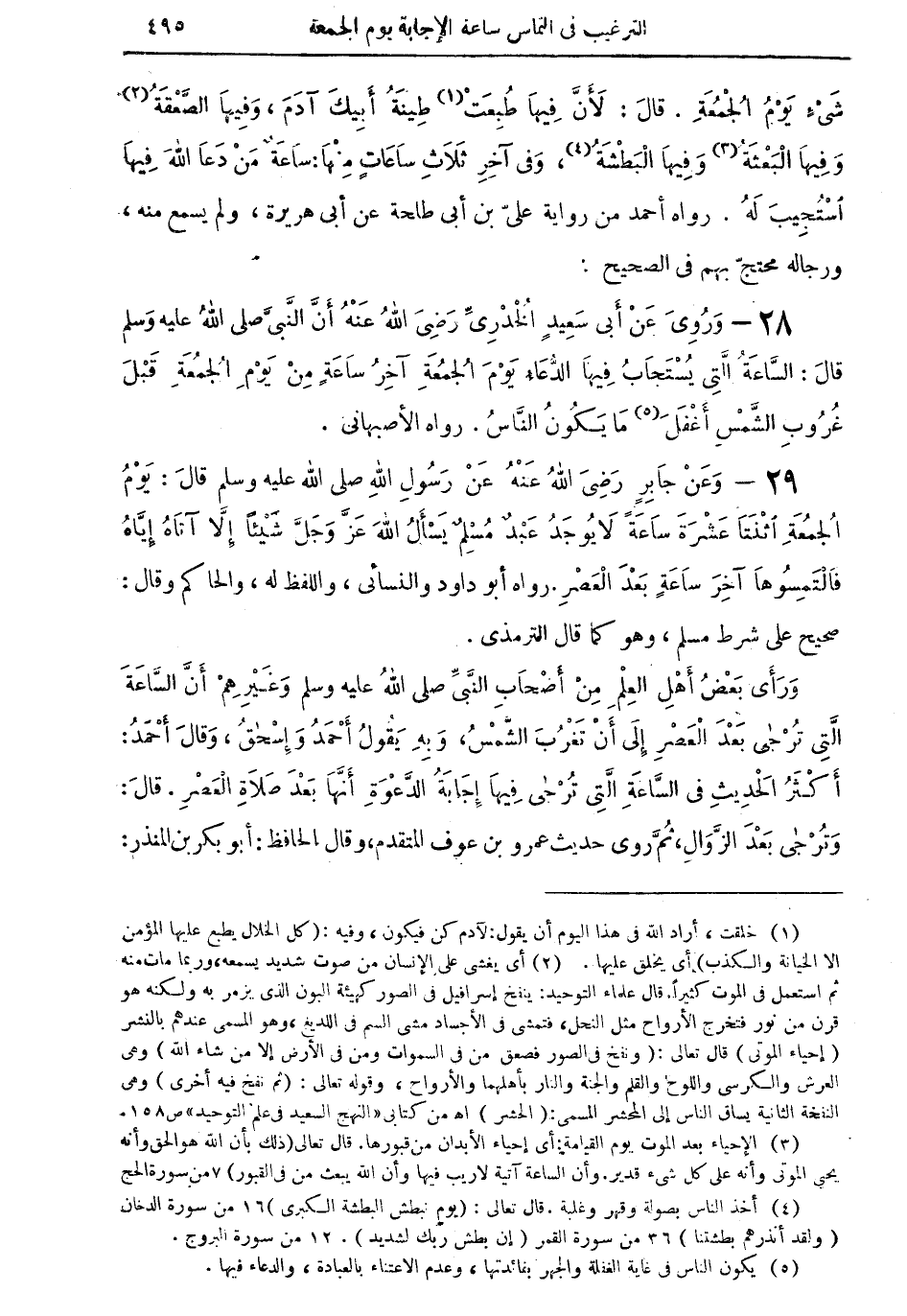 شئٍ يوم الجمعة. قال: لأن فيها طُبعت (¬1) طينةٌ أبيكَ آدم، وفيها الصعقة (¬2) وفيها البعثة (¬3) وفيها البطشة (¬4)، وفي آخر ثلاث ساعاتٍ منها: ساعة من دعا الله فيها استجيب له. رواه أحمد من رواية علىّ بن أبى طلحة عن أبي هريرة، ولم يسمع منه، ورجاله محتجّ بهم في الصحيح.