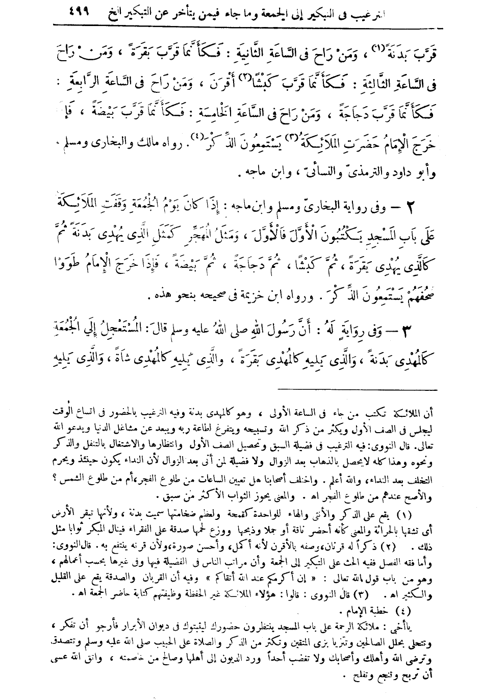 أقرن: ومن راح في الساعة الرابعة: فكأنما قرب دجاجةً، ومن راحة في الساعة الخامسة: فكأنما قرب بيضةً، فإذا خرج الإمام حضرت الملائكة (¬3) يستمعون الذكر (¬4). رواه مالك والبخاري ومسلم، وأبو داود والترمذي والنسائي وابن ماجه.
