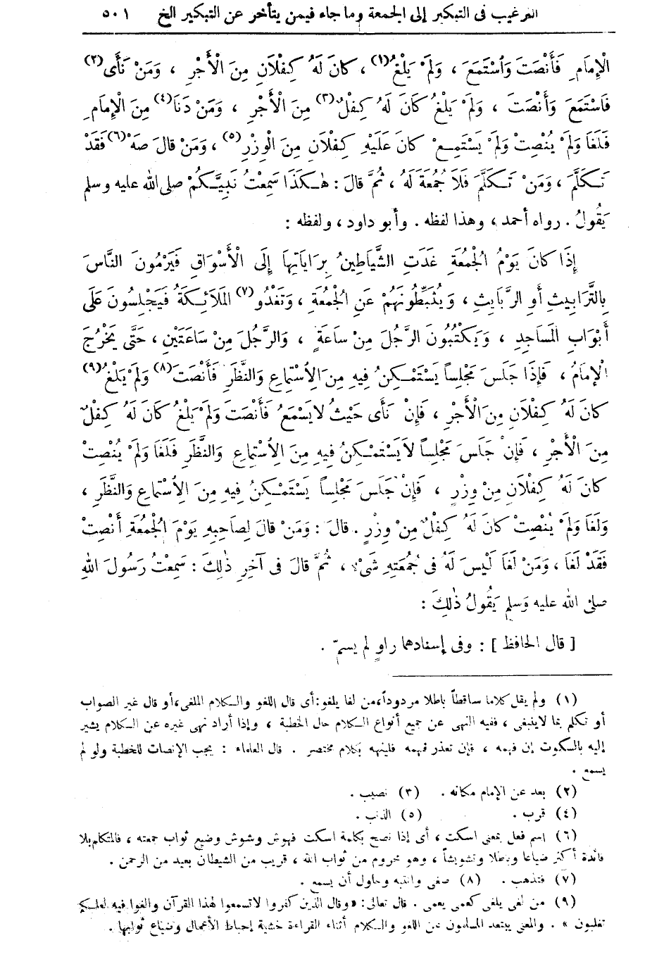 إذا كان يوم الجمعة غدتِ الشياطين براياتها إلى الأسواق فيرمون النسا بالترابيث أو الربايث، ويثبطونهم عن الجمعة، وتغدو (¬7) الملائكة فيجلسون على أبواب المساجد، ويكتبون الرجل من ساعةٍ، والرجل من ساعتين، حتى يخرج الإمام، فإذا جلس مجلسا يستمكن فيه من الاستماع والنظر فأنصت (¬8) ولم يلغ (¬9) كان له كفلان من الأجر، فإن نأى حيث لا يسمع فأنصت ولم يلغ كان له كفلٌ من الأجر، فإن جلس مجلساً لا يستمكن فيه من الاستماع والنظر فلغا ولم ينصت كان له كفلان من وزرٍ، فإن جلس مجلسا يستمكن فيه من الاستماع والنظر، ولغا ولم يُنصت كان له كفلٌ من وزرٍ. قال: ومن قال لصاحبه يوم الجمعة أنصت فقد لغا، ومن لغا ليس له في جمعته شئ، ثم قال آخر ذلك: سمعت رسول الله صلى الله عليه وسلم يقول ذلك: