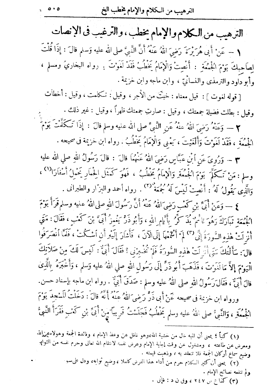 1 - عن أبي هريرة رضي الله عنه أن النبى صلى الله عليه وسلم قال: إذا قُلت لصاحبك يوم الجمعة: أنصت والإمام يخطب فقد لغوت. رواه البخاري ومسلم: وأبو داود والترمذي والنسائيّ، وابن ماجه وابن خزيمة.