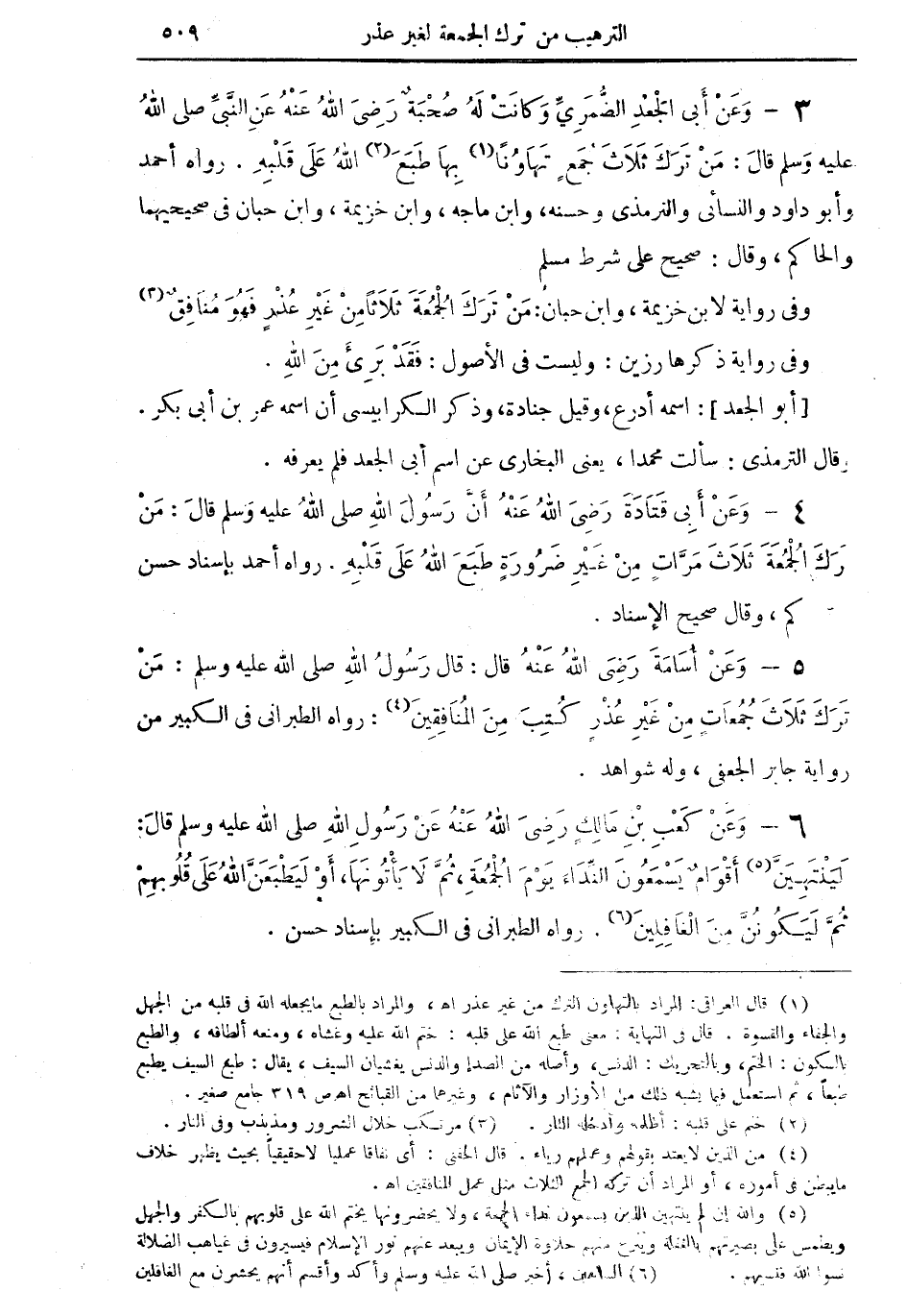 5 - وعن أُسامة رضي الله عنه قال: قال رسول الله صلى الله عليه وسلم: من ترك ثلاث جمعاتٍ من غير عذرٍ كُتب من المنافقين (¬4): رواه الطبراني في الكبير من رواية جابر الجعفى، وله شواهد.