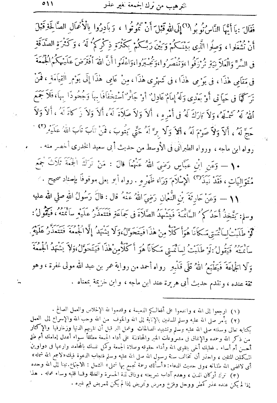 11 - وعن حارثة بن النعمان رضي الله عنه قال: قال رسول الله صلى الله عليه وسلم: يتخذ أحدكم السائمة فيشهد الصلاة في جماعةٍ فتتعذر عليه سائمته، فيقول: لو طلبت لسائمتى مكاناً هُوَ أكلأ من هذا فيتحول، ولا يشهد إلا الجمعة فتتعذر عليه سائمته فيقول: لو طلبت لسائمتى مكاناً هو أكلأ من هذا فيتحول، ولا يشهد الجمعة ولا الجماعة فيطبع الله على قلبه. رواه أحمد من رواية عمر ابن عبد الله مولى غفرة، وهو ثقة عنده، وتقدم حديث أبى هريرة عند ابن ماجه، وابن خزيمة بمعناه.