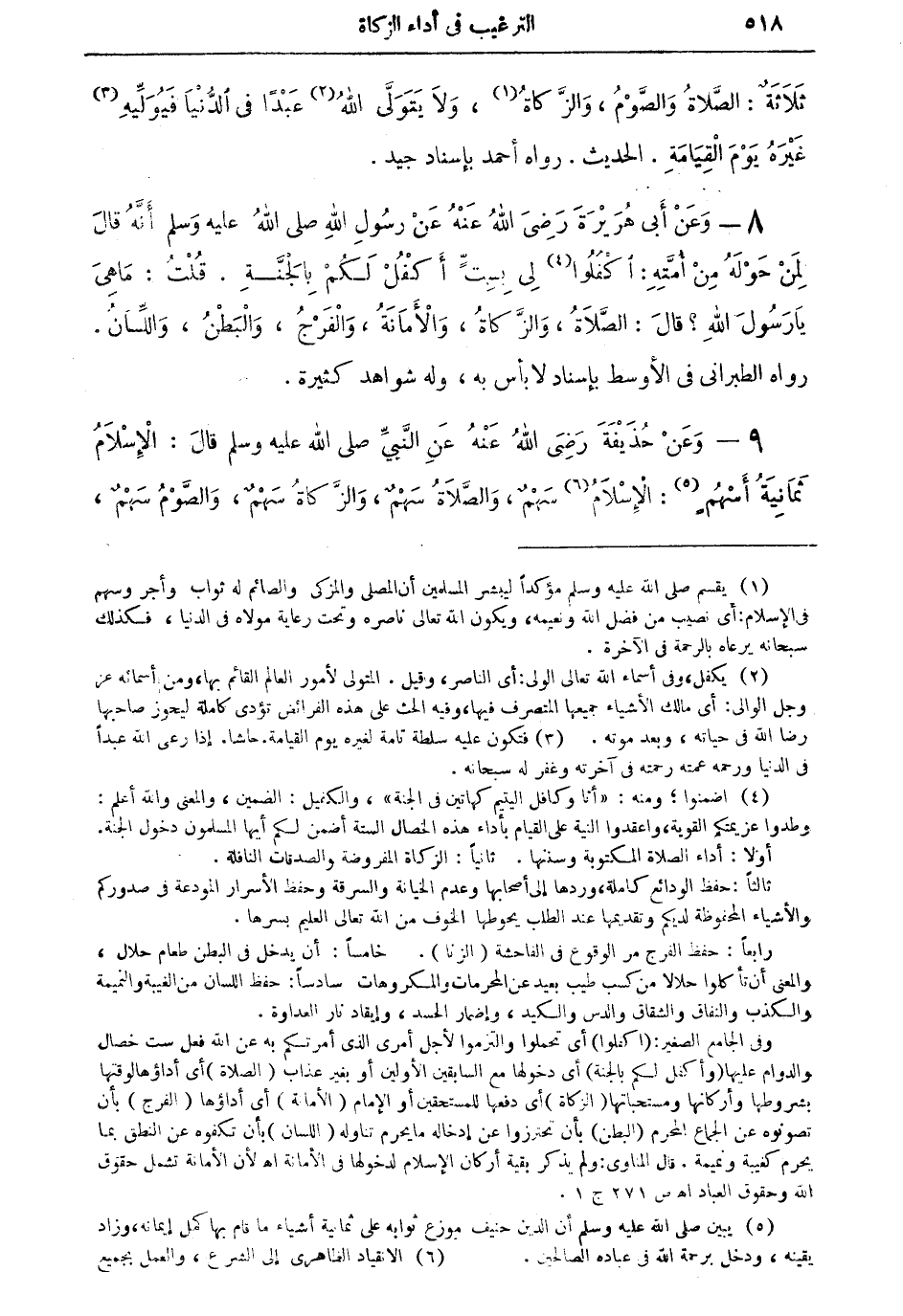 8 - وعن أبي هريرة رضي الله عنه عن رسول الله صلى الله عليه وسلم أنه قال لمن حوله من أُمته: اكفلوا (¬4) لى بست أكفلْ لكم بالجنةِ. قلت: ما هى يا رسول الله؟ قال: الصلاة، والزكاة، والأمانة، والفرج، والبطن، واللسان. رواه الطبراني في الأوسط بإسناد لا بأس به، وله شواهد كثيرة.