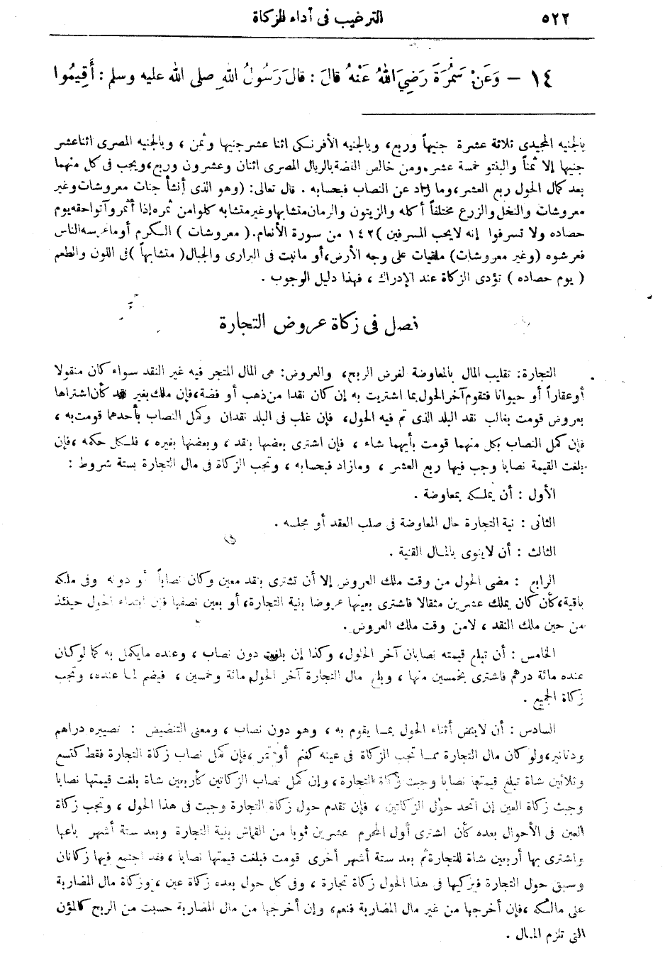 = بالجنية المجيدى ثلاثة عشر جنيهاً وربع، وبالجنية الأفرنكى اثنا عشر جنيها وثمن، وبالجنية المصري اثنا عشر جنيها إلا ثمناً والبنتو خمسة عشر، ومن خالص الفضة بالريال المصري اثنان وعشرون وربع، ويجب في كل منهما بعد كمال الحول ربع العشر، ومازاد عن النصاب فبحسابه. قال تعالى: (وهو الذى أنشأ جنات معروشات وغير معروشات والنخل والزرع مختلفاً أكله والزيتون والرمان متشابها وغير متشابه كلوا من ثمره إذا أثمر وآتوا حقه يوم حصاده ولا تسرفوا إنه لا يحب المسرفين) 142 من سورة الأنعام. (معروشات) الكرم أو ما غرسه الناس فعرشوه (وغير معروشات) ملقيات على وجه الأرض، أو ما نبت في البرارى والجبال (متشابهاً) في اللون والطعم (يوم حصاده) تؤدى الزكاة عند الإدراك، فهذا دليل الوجوب.