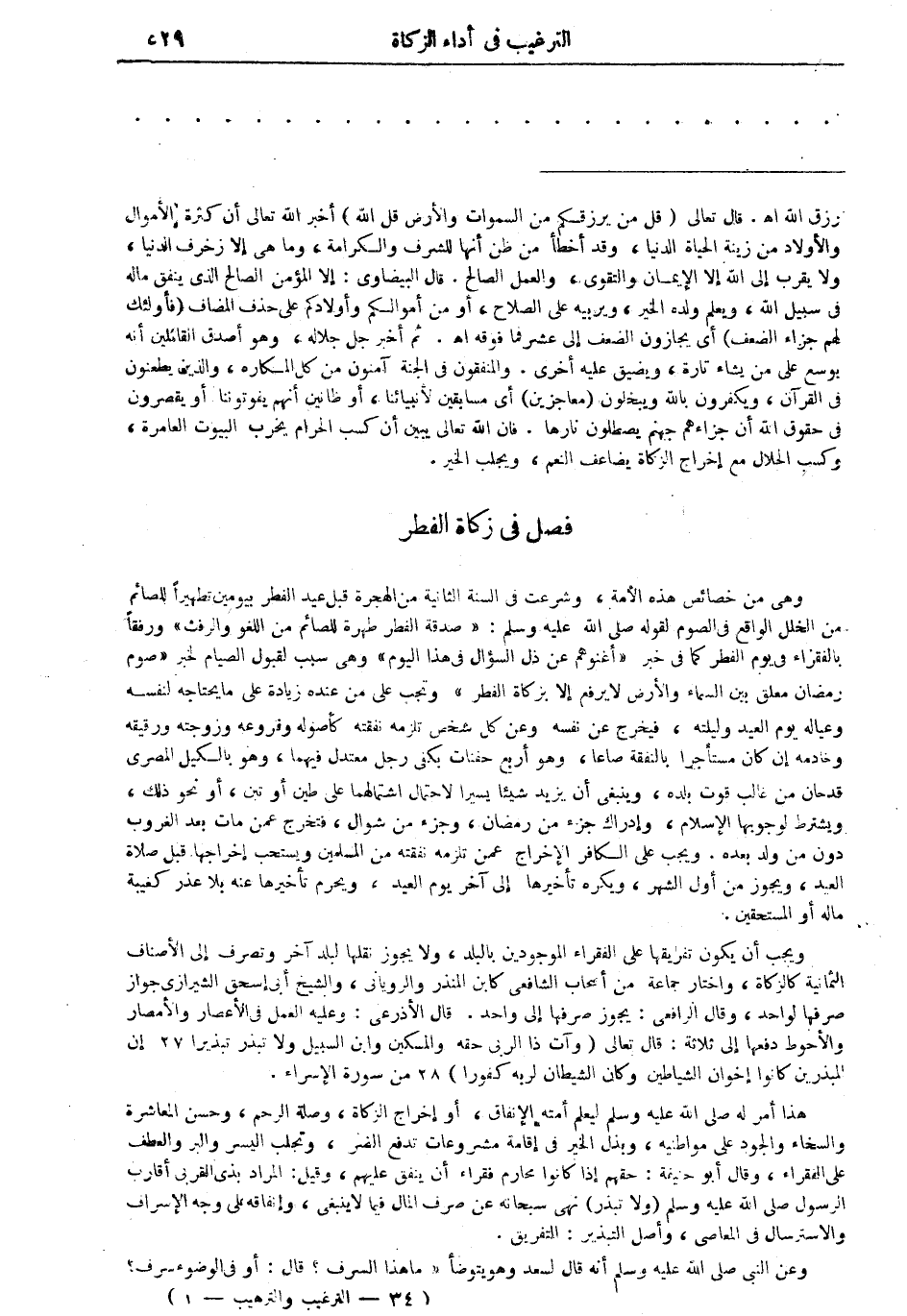وهى من خصائص هذه الأمة، وشرعت في السنة الثانية من الهجرة قبل عيد الفطر بيومين تطهيراً للصائم من الخلل الواقع في الصوم لقوله صلى الله عليه وسلم: (صدقة الفطر طهرة للصائم من اللغو والرفث) ورفقاً بالفقراء في يوم الفطر كما في خبر (أغنوهم عن ذل السؤال في هذا اليوم) وهى سبب لقبول الصيام لخبر (صوم رمضان معلق بين السماء والأرض لا يرفع إلا بزكاة الفطر) وتجب على من عنده زيادة على ما يحتاجه لنفسه وعياله يوم العيد وليلته، فيخرج عن نفسه وعن كل شخص تلزمه نفقته كأصوله وفروعه وزوجته ورقيقه وخادمه إن كان مستأجرا بالنفقة صاعا، وهو أربع حفنات بكفى رجل معتدل فيهما، وهو بالكيل المصري قدحان من غالب قوت بلده، وينبغى أن يزيد شيئا يسيرا لاحتمال اشتمالهما على طين أو تبن، أو نحو ذلك، ويشترط لوجوبها الإسلام، وإدراك جزء من رمضان، وجزء من شوال، فتخرج عمن مات بعد الغروب دون من ولد بعده. ويجب على الكافر الإخراج عمن تلزمه نفقته من المسلمين ويستحب إخراجها قبل صلاة العيد، ويجوز من أول الشهر، ويكره تأخيرها إلى آخر يوم العيد، ويحرم تأخيرها عنه بلا عذر كغيبة ماله أو المستحقين.