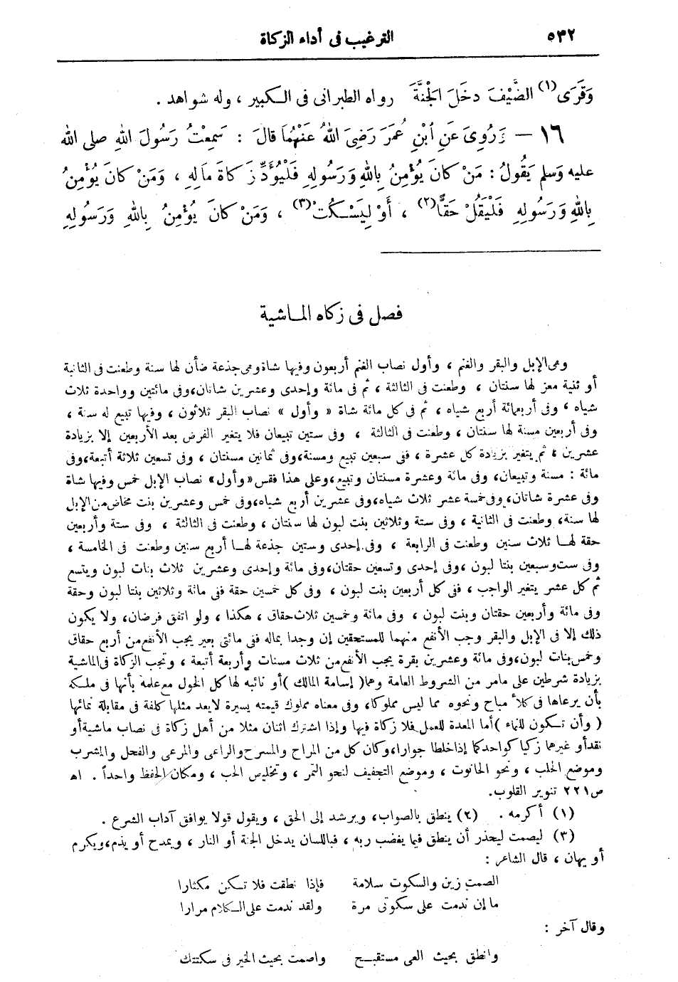 16 - وروى عن ابن عمر رضي الله عنهما قال: سمعت رسول الله صلى الله عليه وسلم يقول: من كان يؤمن بالله ورسوله فليؤد زكاة ماله، ومن كان يؤمن بالله ورسوله فليقل حقا (¬2)، أو ليسكت (¬3)، ومن كان يؤمن بالله ورسوله