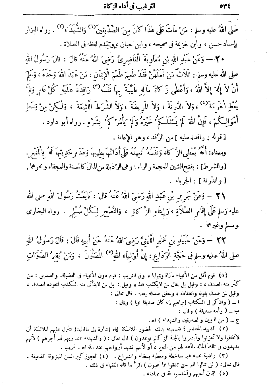 21 - وعن جرير بن عبد الله رضي الله عنه قال: بايعت رسول الله صلى الله عليه وسلم على إقام الصلاة، وإيتاء الزكاة، والنصح لكل مسلمٍ. رواه البخاري ومسلم وغيرهما.