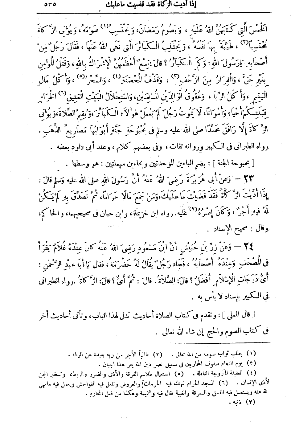 24 - وعن زر بن حُبيشٍ أن ابن مسعودٍ رضي الله عنه كان عنده غلام يقرأُ في المصحف وعنده أصحابه، فجاء رجل يقال له حضرمة، فقال يا أبا عبد الرحمن: أي درجات الإسلام أفضل؟ قال: الصلاة. قال: ثم أىٌّ؟ قال: الزكاة. رواه الطبراني في الكبير بإسناد لا بأس به.