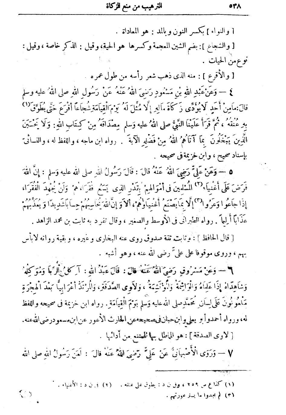 4 - وعن عبد الله بن مسعودٍ رضي الله عنه عن رسول الله صلى الله عليه وسلم قال: ما من أحدٍ لا يُؤدى زكاة ماله إلا مثل له يوم القيامة شجاعاً أقرع حتى يُطوق (¬1) به عنقه، ثم قرأ علينا النبى صلى الله عليه وسلم مصداقه من كتاب الله: ولا يحسبن الذين يبخلون بما آتاهم الله من فضله الآية. رواه ابن ماجه، واللفظ له، والنسائي بإسناد صحيح، وابن خزيمة في صحيحه.