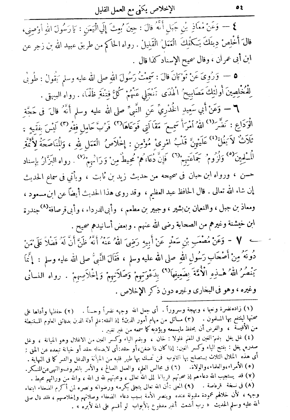 4 - وعن معاذ بن جبل أنه قال: حين بُعث إلى اليمن: يا رسول الله أوصنى، قال أخلص دينك يكفك العمل القليل. رواه الحاكم من طريق عبيد الله بن زجر عن ابن أبى عمران، وقال صحيح الإسناد كذا قال.