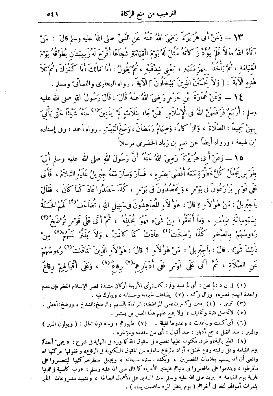 13 - وعن أبي هريرة رضي الله عنه عن النبى صلى الله عليه وسلم قال: من آتاهُ الله مالاً فلم يُؤد زكاته مثل له يوم القيامة شجاعاً أقرع له زبيبتان يطوقه يوم القيامة، ثم يأخذ بلهزمتيه، يعنى شدقيه، ثم يقول: أنا مالك أنا كنزك، ثم تلا هذه الآية: (ولا يحسبن الذين يبخلون) الآية. رواه البخاري والنسائي ومسلم.