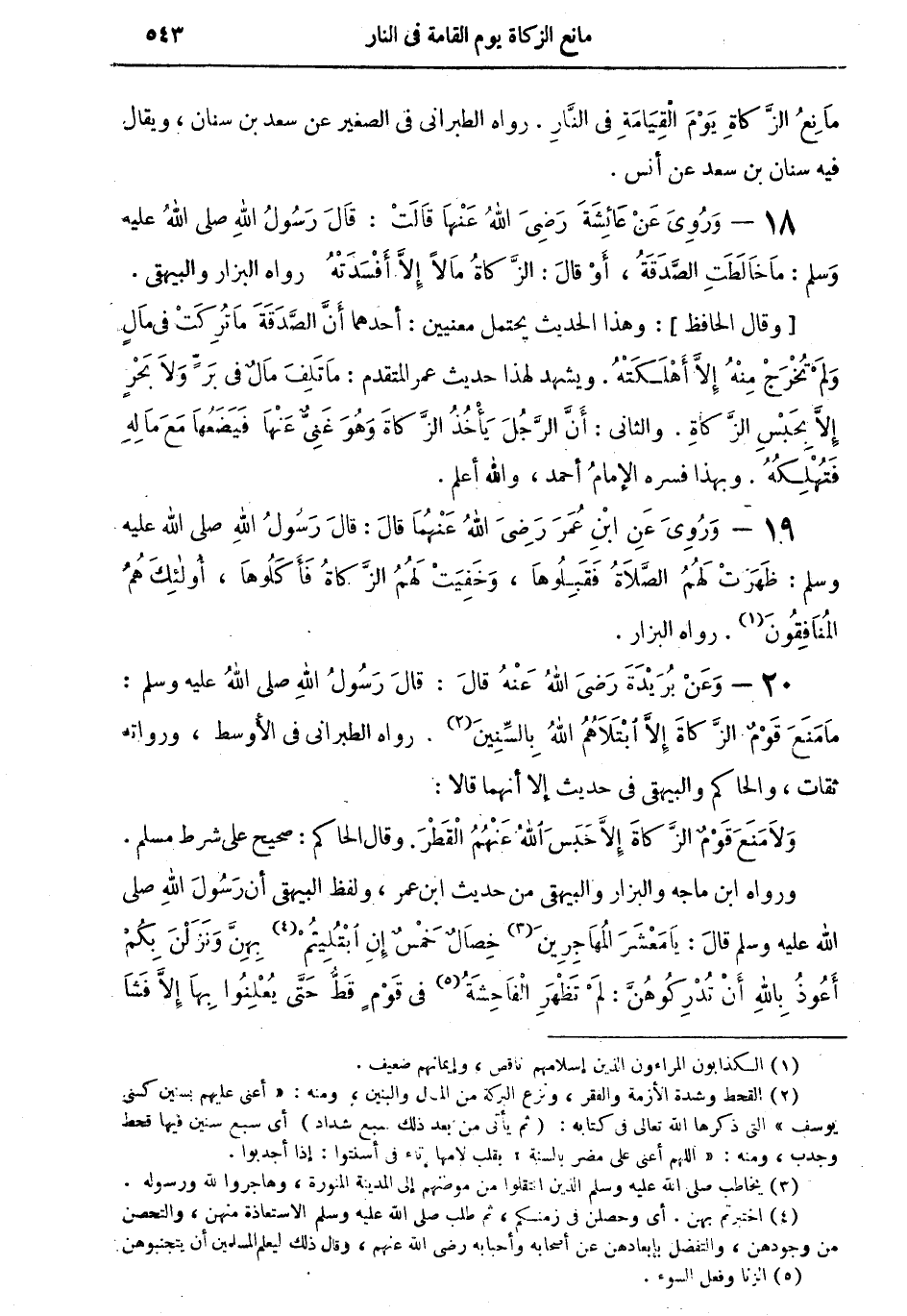 20 - وعن بريدة رضي الله عنه قال: قال رسول الله صلى الله عليه وسلم: ما منع قومٌ الزكاة إلا ابتلاهم الله بالسنين (¬2). رواه الطبراني في الأوسط، ورواته ثقات، والحاكم والبيهقى في حديث إلا أنهما قالا: