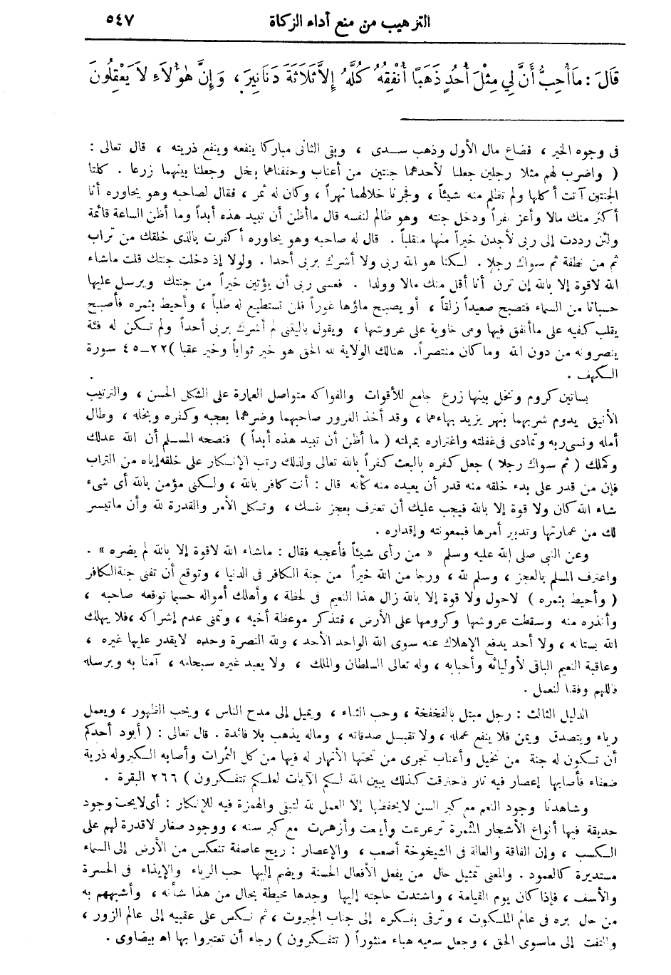 = في وجوه الخير، فضاع مال الأول وذهب سدى، وبقى الثانى مباركا ينفعه وينفع ذريته، قال تعالى: (واضرب لهم مثلا رجلين جعلنا لأحدهما جنتين من أعناب وحففناهما بنخل وجعلنا بينهما زرعا. كلتا الجنتين آتت أكلها ولم تظلم منه شيئاً، وفجرنا خلالهما نهراً، وكان له ثمر، فقال لصاحبه وهو يحاوره أنا أكثر منك مالا وأعز نفراً ودخل جنته وهو ظالم لنفسه قال ما أظن أن تبيد هذه أبداً وما أظن الساعة قائمة ولئن رددت إلى ربى لأجدن خيراً منها منقلباً. قال له صاحبه وهو يحاوره أنا أكثر منك مالا وأعز نفراً ودخل جنته وهو ظالم لنفسه قال ما أظن أن تبيد هذه أبداً وما أظن الساعة قائمة ولئن رددت إلى ربى لأجدن خيراً منها منقلباً. قال له صاحبه وهو يحاوره أكفرت بالذى خلقك من تراب ثم من نطفة ثم سواك رجلا. لكنا هو الله ربى ولا أشرك بربى أحدا. ولولا إذ دخلت جنتك قلت ما شاء الله لا قوة إلا بالله إن ترن أنا أقل منك مالا وولدا. فعسى ربى أن يؤتين خيراً من جنتك ويرسل عليها حسبانا من السماء فتصبح صعيداً زلقا، أو يصبح ماؤها غورا فلن تستطيع له طلبا، وأحيط بثمره فأصبح يقلب كفيه على ما أنفق فيها وهى خاوية على عروشها، ويقول ياليتنى لم أشرك بربى أحداً ولم تكن له فئة ينصرونه من دون الله وما كان منتصراً. هنالك الولاية لله الحق هو خير ثواباً وخير عقبا) 32 - 44 سورة الكهف.