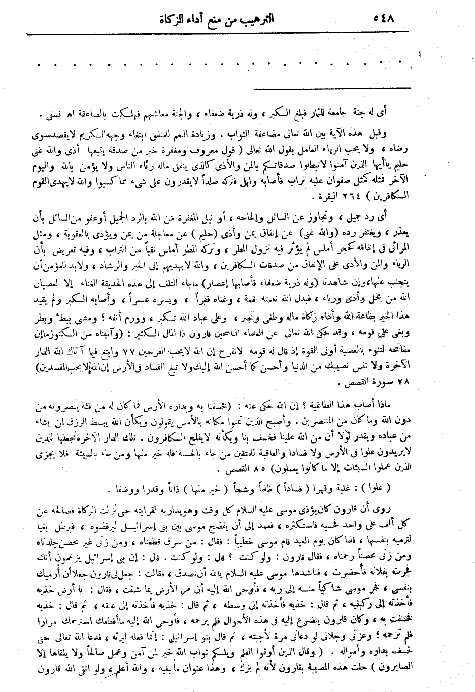 روى أن قارون كان يؤذى موسى عليه السلام كل وقت وهو يداريه لقرابته حتى نزلت الزكاة فصالحه عن كل ألف على واحد فحسبه فاستكثره، فعمد إلى أن يفضح موسى بين بنى إسرائيل ليرفضوه، فبرطل بغيا لترميه بنفسها، فلما كان يوم العيد قام موسى خطيباً: فقال: من سرق قطعناه، ومن زنى غير محصن جلدناه ومن زنى محصناً رجمناه، فقال قارون: ولو كنت؟ قال: ولو كنت. قال: إن بنى إسرائيل يزعمون أنك فجرت بفلانة فأحضرت، فناشدها موسى عليه السلام بالله أن تصدق، فقالت: جعل لى قارون جعلا أن أرميك بنفسى، فخر موسى شاكياً منه إلى ربه، فأوحى إليه أن مر الأرض بما شئت، فقال: ياأرض خذيه فأخذته إلى ركبتيه، ثم قال: خذيه فأخذته إلى وسطه، ثم قال: خذيه فأخذته إلى عنقه، ثم قال: خذيه فخسفت به، وكان قارون يتضرع إليه في هذه الأحوال فلم يرحمه، فأوحى الله إليه ما أفظعك استرحمك مرارا فلم ترحمه؛ وعزتى وجلالى لو دعانى مرة لأجبته، ثم قال بنو إسرائيل: إنما فعله ليرثه، فدعا الله تعالى حتى خسف بداره وأمواله. (وقال الذين أوتوا العلم ويلكم ثواب الله خير لمن آمن وعمل صالحاً ولا يلقاها إلا الصابرون) حلت هذه المصيبة بقارون لأنه لم يزك، وهذا عنوان ما نبغيه، والله أعلم، ولو اتقى الله قارون =