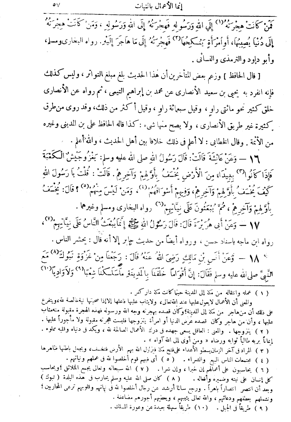 فمن كانت هجرته (¬1) إلى الله ورسوله فهجرته إلى الله ورسوله، ومن كانت هجرته إلى دنيا يصيبها، أو امرأة ينكحها (¬2) فهجرته إلى ما هاجر إليه. رواه البخاري ومسلم وأبو داود والترمذي والنسائي.