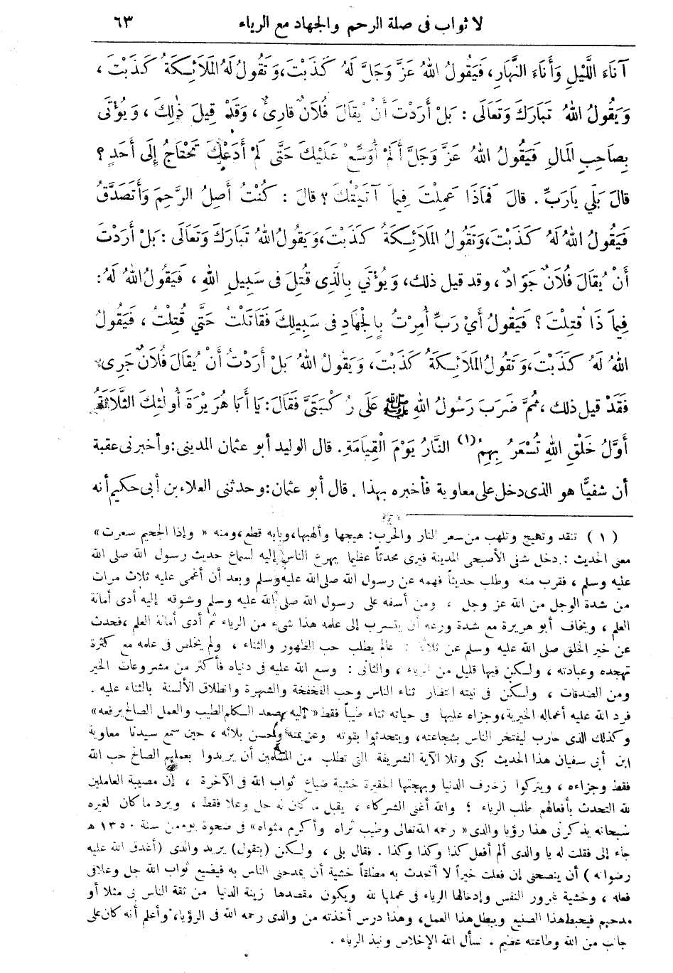 (¬1) تتقد وتهيج وتلهب، من سعر النار والحرب: هيجها وألهبها، وبابه قطع، ومنه (وإذا الجحيم سعرت) معنى الحديث: دخل شفى الأصبحى المدينة فيرى محدثاً عظيما يهرع الناس لسماع حديث رسول الله صلى الله عليه وسلم، فقرب منه وطلب حديثاً فهمه عن رسول الله صلى الله عليه وسلم، وبعد أن أغمى عليه ثلاث مرات من شدة الوجل من الله عز وجل، ومن أسفه على رسول الله صلى الله عليه وسلم وشوقه إليه أدي أمانة العلم، ويخاف أبو هريرة مع شدة ورعه أن يتسرب إلى علمه هذا شئ من الرياء ثم أدى أمانة العلم، فحدث عن خير الخلق صلى الله عليه وسلم عن ثلاثة: عالم يطلب حب الظهور والثناء، ولم يخلص في علمه مع كثرة تهجده وعبادته، ولكن فيها قليل من الرياء، والثاني: وسع الله عليه في دنياه فأكثر من مشروعات الخير ومن الصدقات، ولكن في نيته انتظار ثناء الناس وحب الفخفخة والشهرة وانطلاق الألسنة بالثناء عليه، فرد الله عليه أعماله الخيرية، وجزاه عليها في حياته ثناء طيباً فقط (إليه يصعد الكلم الطيب والعمل الصالح يرفعه) وكذلك الذي حارب ليفتخر الناس بشجاعته، ويتحدثوا بقوته وعزيمته وحسن بلائه، حين سمع سيدنا معاوية بن أبى سفيان هذا الحديث بكى، وتلا الآية الشريفة التي تطلب من المسلمين أن يريدوا بعملهم الصالح حب الله فقط وجزاءه ويتركوا زخارف الدنيا وبهجتها الحقيرة خشية ضياع ثواب الله في الآخرة، ويرد ما كان لغيره سبحانه. يذكرني هذا رؤيا والدى (رحمه الله تعالى وطيب ثراه وأكرم مثواه) في ضحوة يوم من سنة 1350 هـ جاء إلى فقلت له ياوالدى ألم افعل كذا وكذا وكذا. فقال بلى، ولكن (بنقول) يريد والدي (أغدق الله عليه رضوانه) أن ينصحنى إن فعلت خيراً لا أتحدث به مطلقاً خشية أن يمدحنى الناس به فيضيع ثواب الله جل وعلا في فعله، وخشية غرور النفس وإدخالها الرياء في عملها لله ويكون مقصدها زينة الدنيا من ثقة الناس بي مثلا أو مدحهم فيحبط هذا الصنيع ويبطل هذا العمل، وهذا درس أخذته من والدي رحمه الله في الرؤيا، وأعلم أنه كان على جانب من الله وطاعته عظيم. نسأل الله الإخلاص ونبذ الرياء.